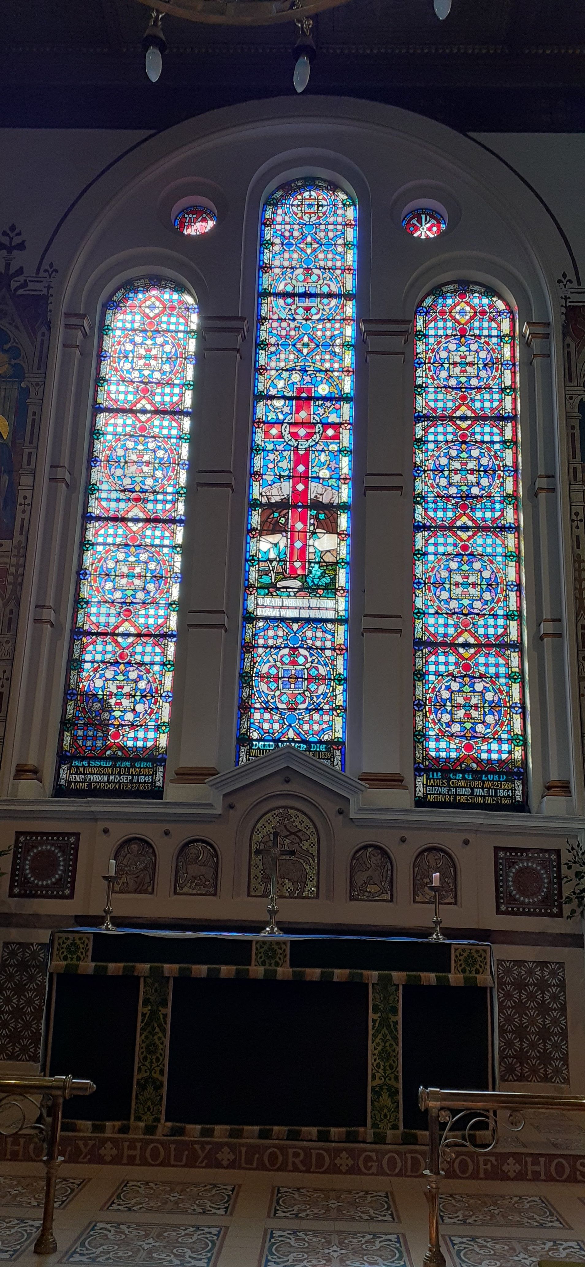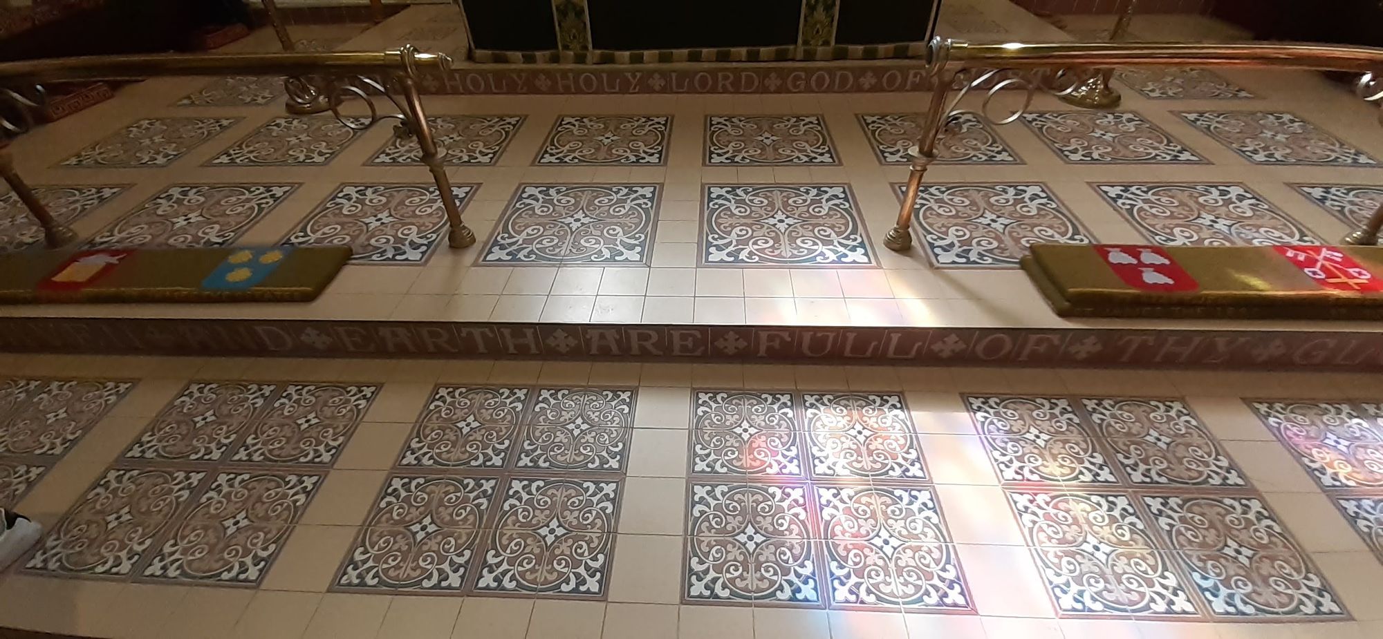Each pew has individual needlepoint kneelers--two longer versions seen above. This is normal in Church of Ireland churches, which this is. Of course initially a Catholic church, but Church of Ireland after the plantation of Ulster.