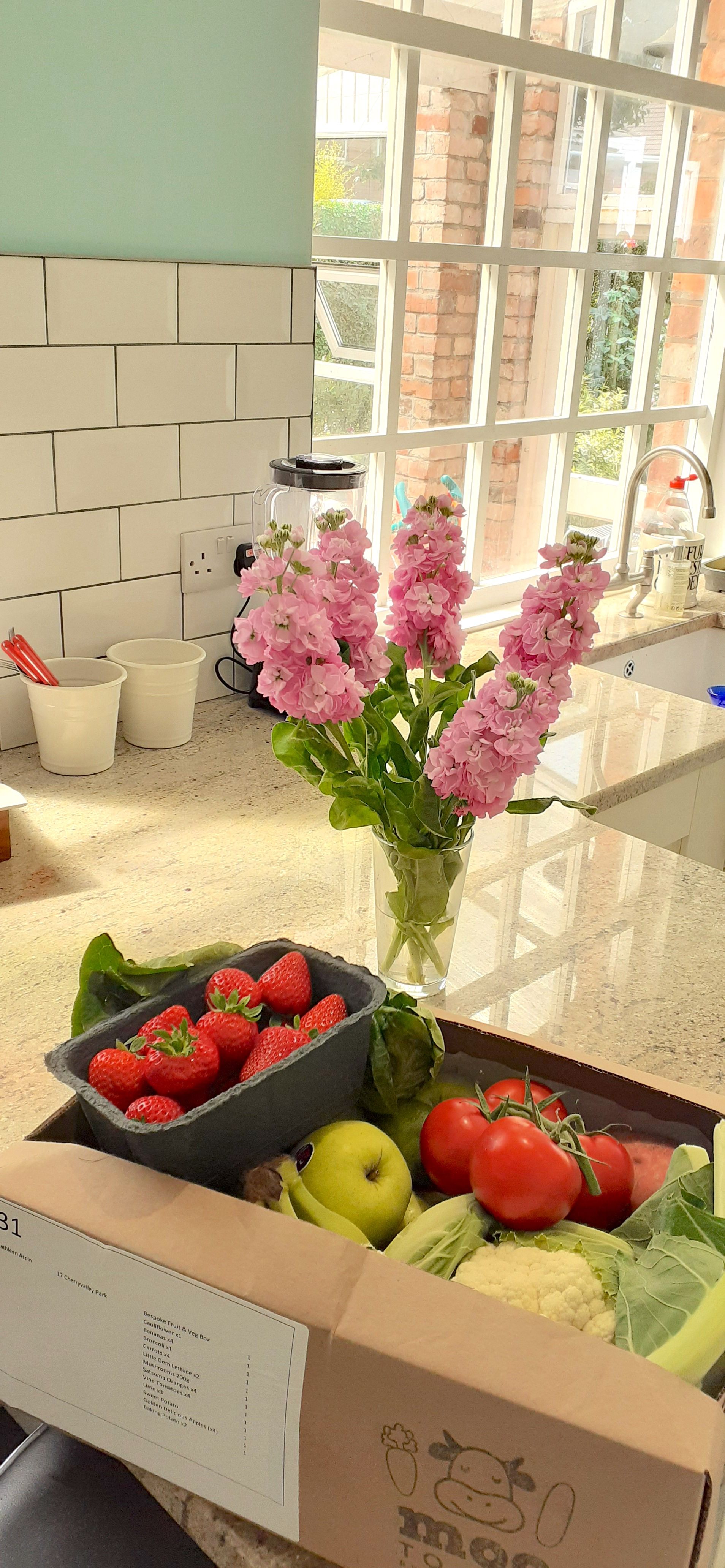 The day I came home from Wales, my friend Eddis was at the house. I had asked her to check on Paddy because David left for Sligo the day I returned. Eddis brought me a tray of potato gratin, a bag of veg, a chocolate Swiss roll, and a bouquet of flowers. How is that for a good friend? This photo shows the flowers and a box of fruit and veg I ordered from Moo to You, a local farm.
