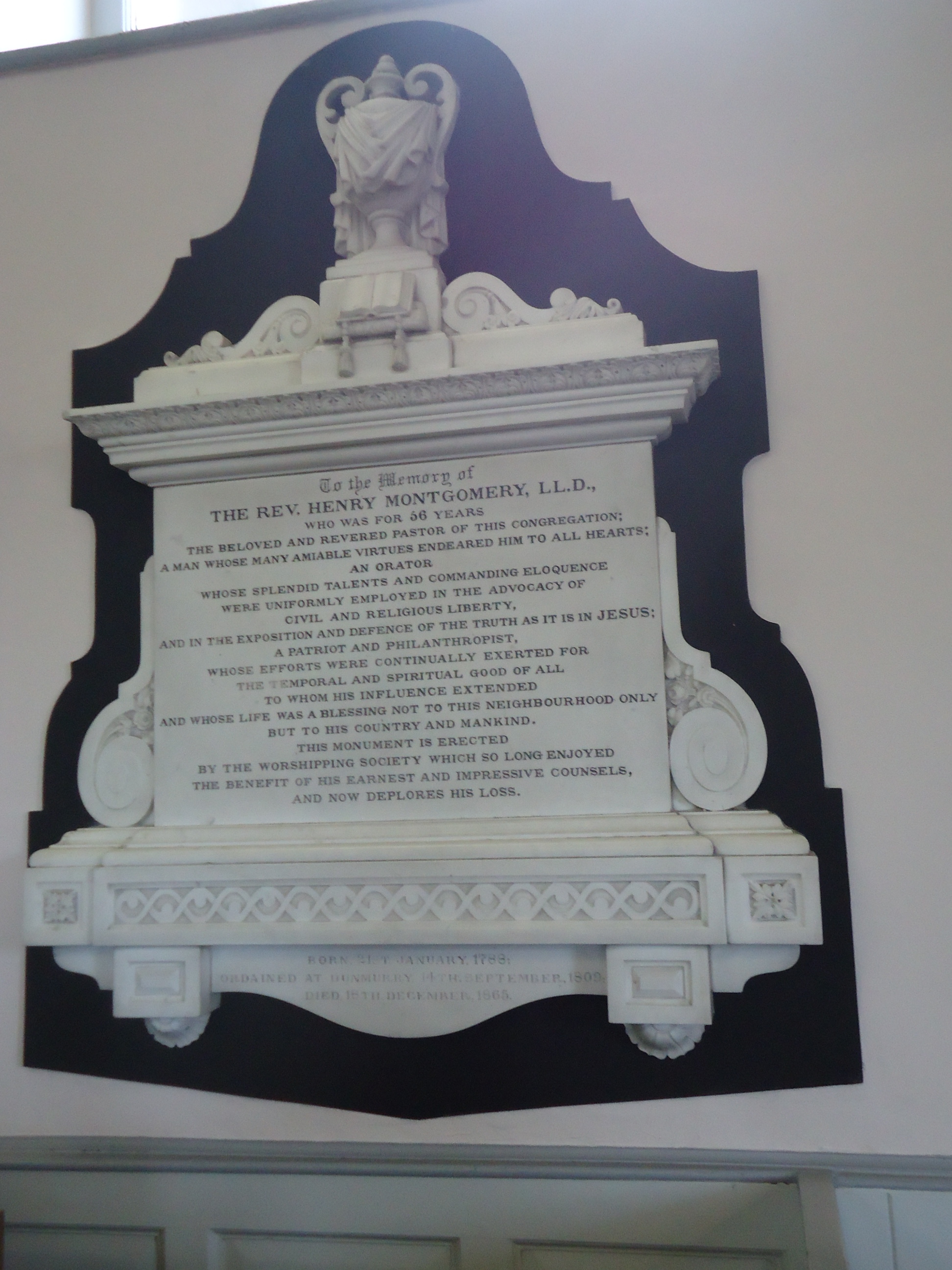 A fellow minister wrote that “Rev. Montgomery was prominent in all efforts to advance the cause of civil and religious liberty. In the great question of Catholic Emancipation he took a conspicuous part; and it is not too much to say that his eloquent appeals contributed to the ultimate triumph of the Catholic cause, and helped to wrest from an un willing Government rights which had been so long and so unjustly withheld."