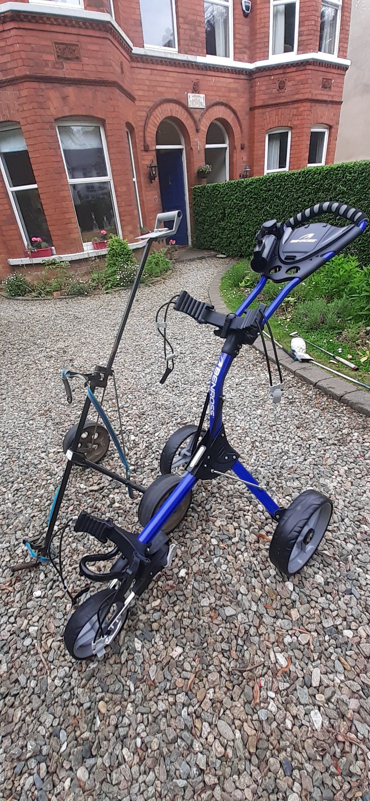 Of course there was golf on Friday and Sunday. The big accomplishment this weekend was assembling things. First, my new golf trolley, parked next to its rusting, rickety predecessor, given to me by a friend. This was a birthday present to myself that has been awaiting assembly.