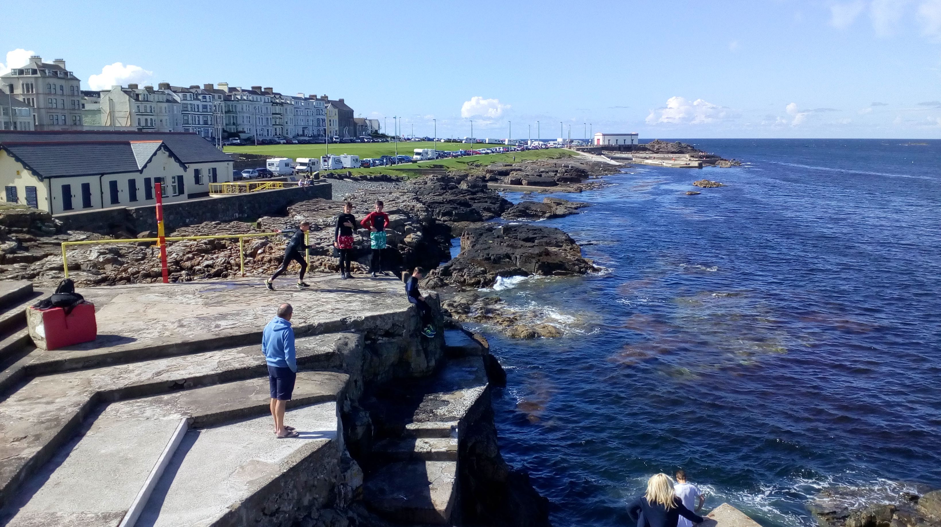 During a break, I took a few photos of Portrush beach and a watering hole where kids jump off the rocks into the water, as a boy here is about to do.