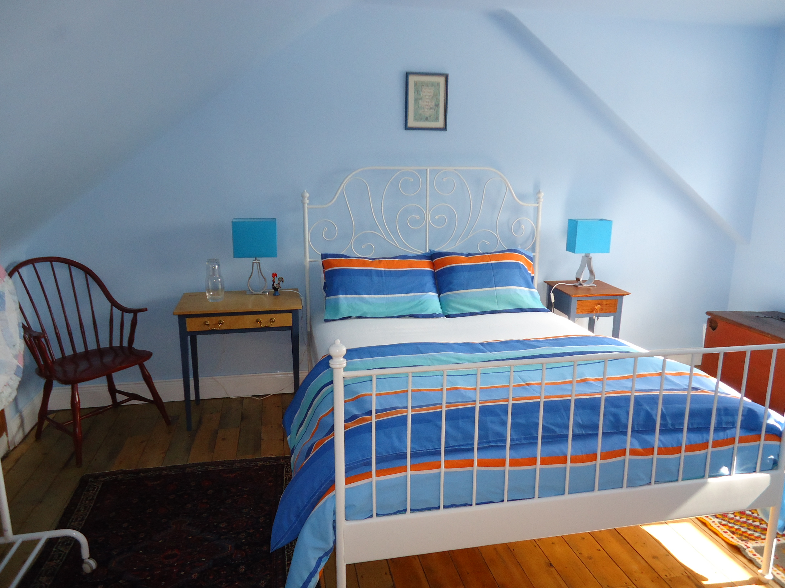 Here are the four walls of the guest bedroom, before and after. The ceiling was torn out as well as the two Velux windows. The ceiling/roof on either side of the window was raised to give more head room. Note the black-out blind we added--necessitated by the sun rising around 4:30 a.m. and setting around 10 p.m.