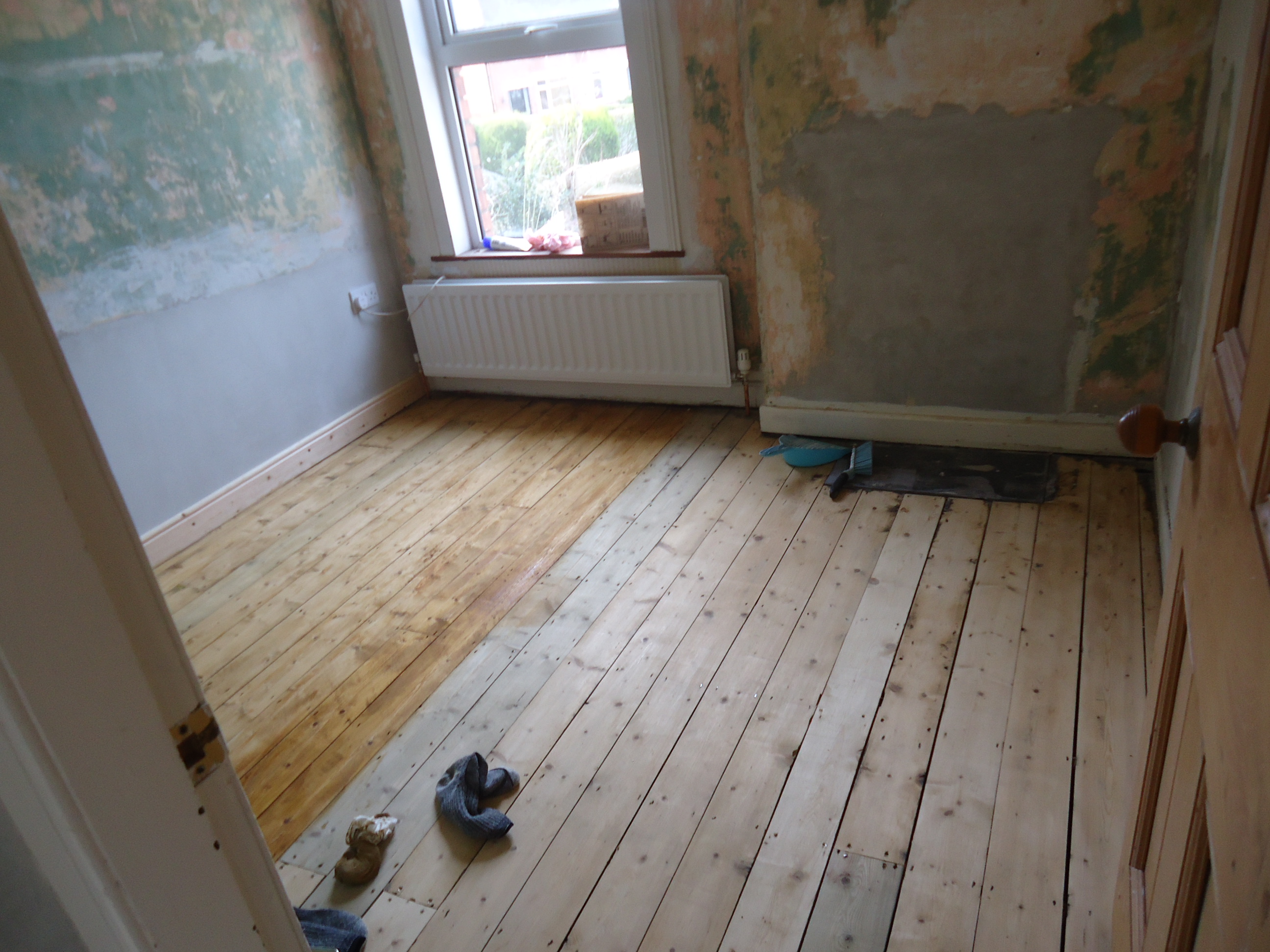 This is my future office. The stained section represents an hour of (backbreaking) work. This and the master bedroom have a single coat of stain. We now have to decide if they are getting a second coat of stain and whether or not to polyurethane. Partly this is a decision of how long will we be able to hold out before we can begin to unpack and live like normal people. You don't want to move in furniture, rugs, clothes and THEN decide you want it darker and shinier.
