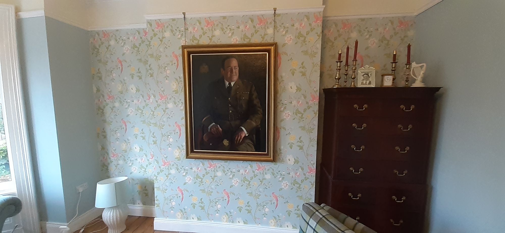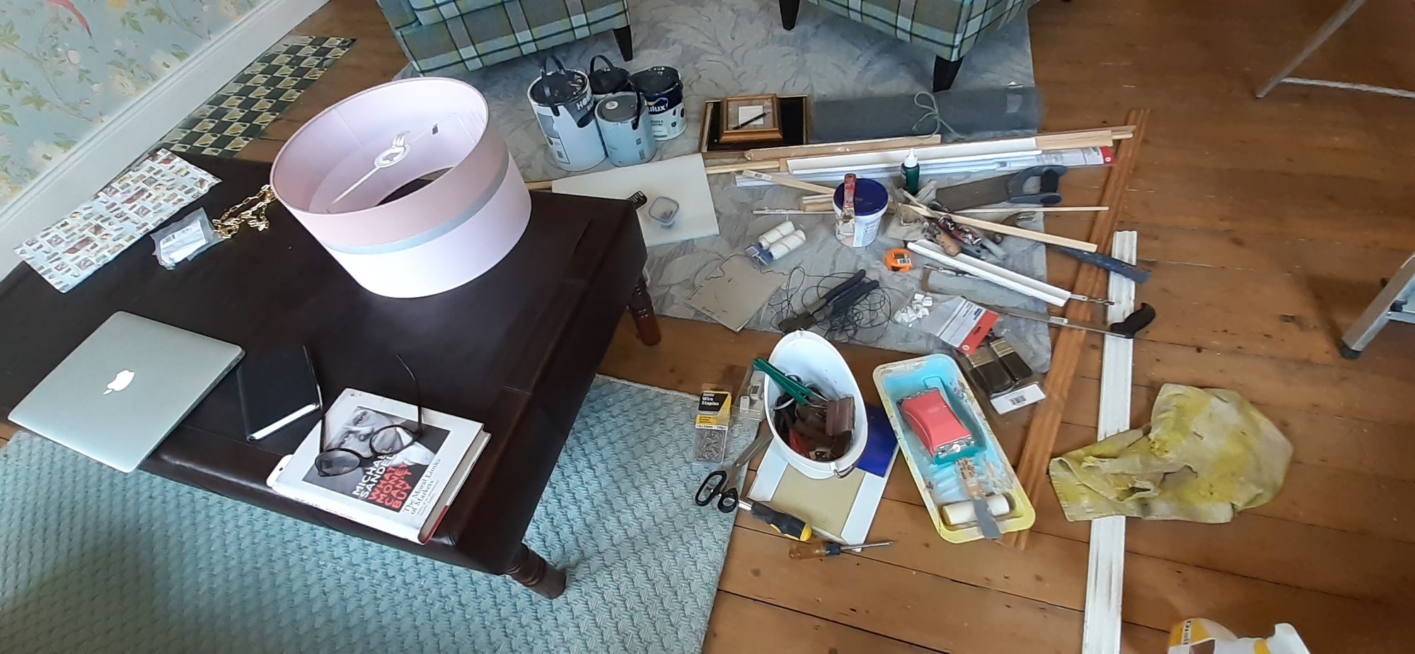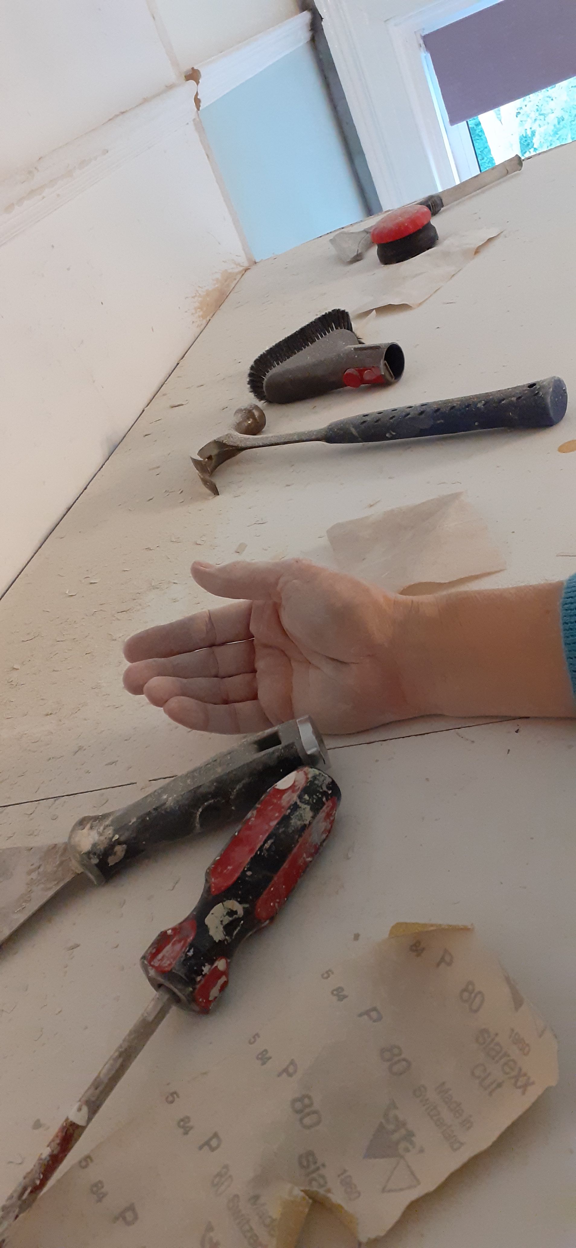 A framing shop is collecting two photos from the house (wedding portraits), having them framed and delivering them back. That will help with the wall above. Below is work underway on the wardrobe. Four days removing the ceiling wallpaper and cleaning up. Four days sanding plaster and cleaning up. And then work to re-create the mouldings. I can't wait to start painting but still have a lot of spackling to do.