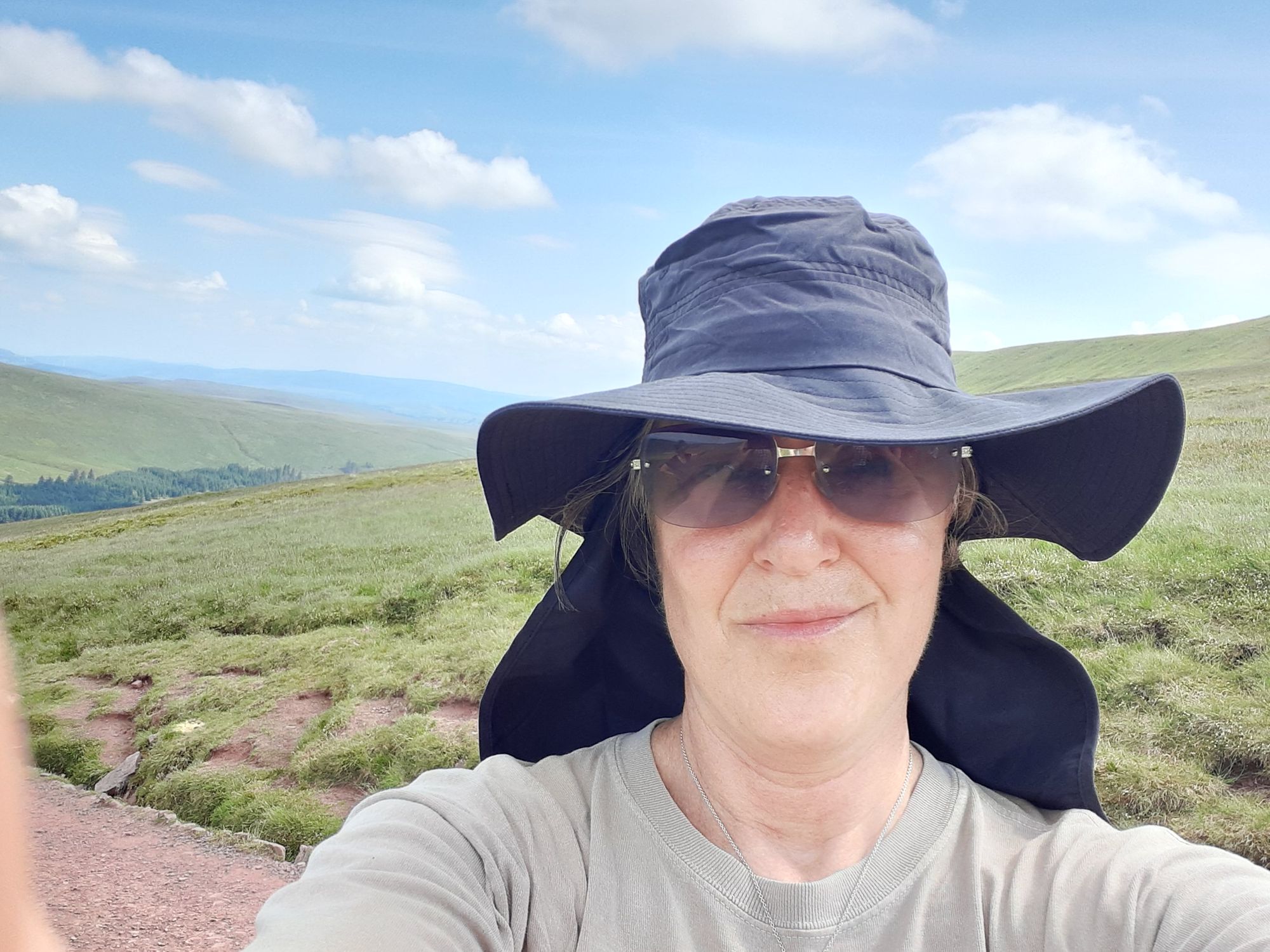 Today's hike was up to Pen Y Fan, the highest peak in the bottom half of the UK. We covered about 10 miles and also hit the peak of Corn Du on the way down. Total ascent in the 1750 foot range. I got so sunburnt yesterday that I went out before today's hike and bought a ridiculous looking hat to shield me from the sun.