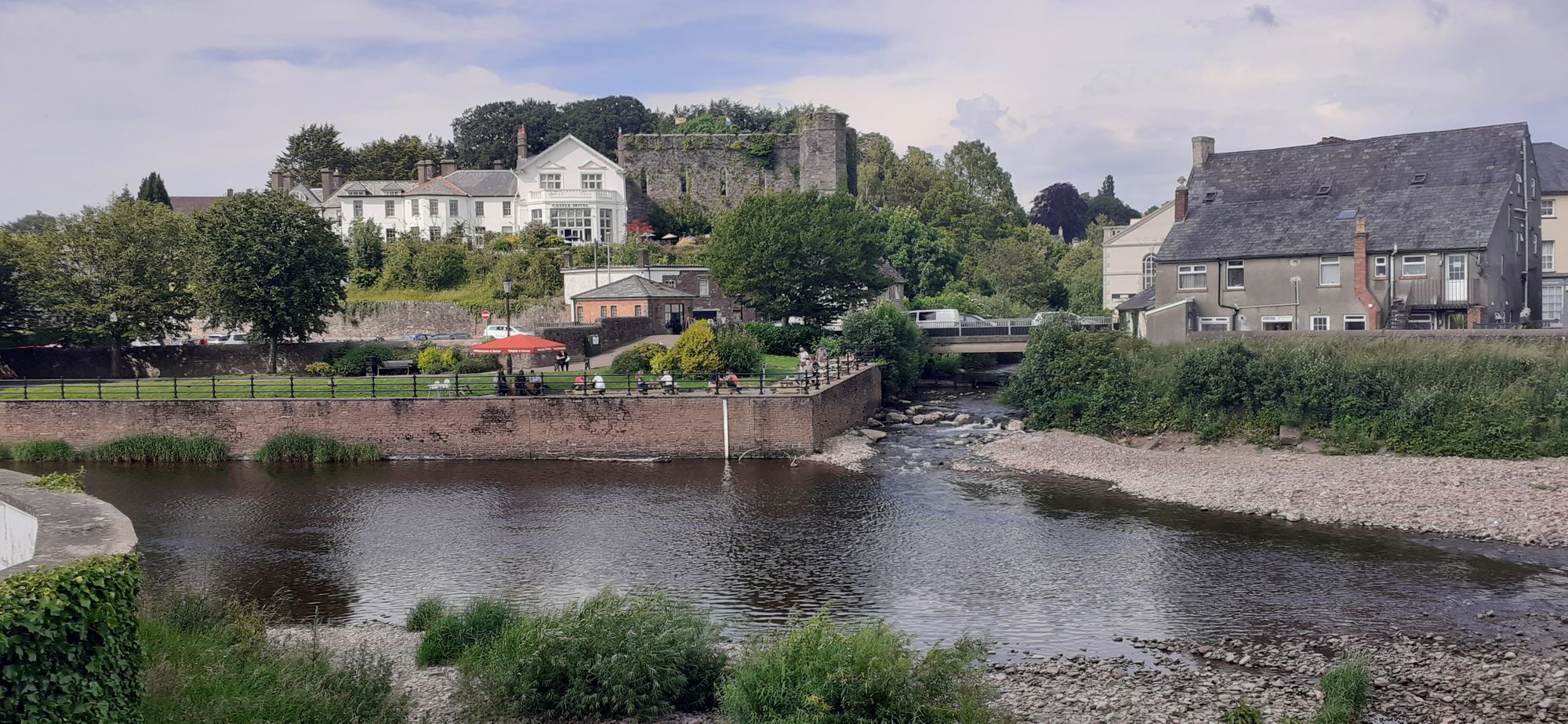We were hiking back to Brecon, which we could see in the distance, which made it harder. As compensation, we stopped for ice cream in the west end of Brecon. Then we crossed the bridge into town, with a nice view of the castle and Castle Hotel.