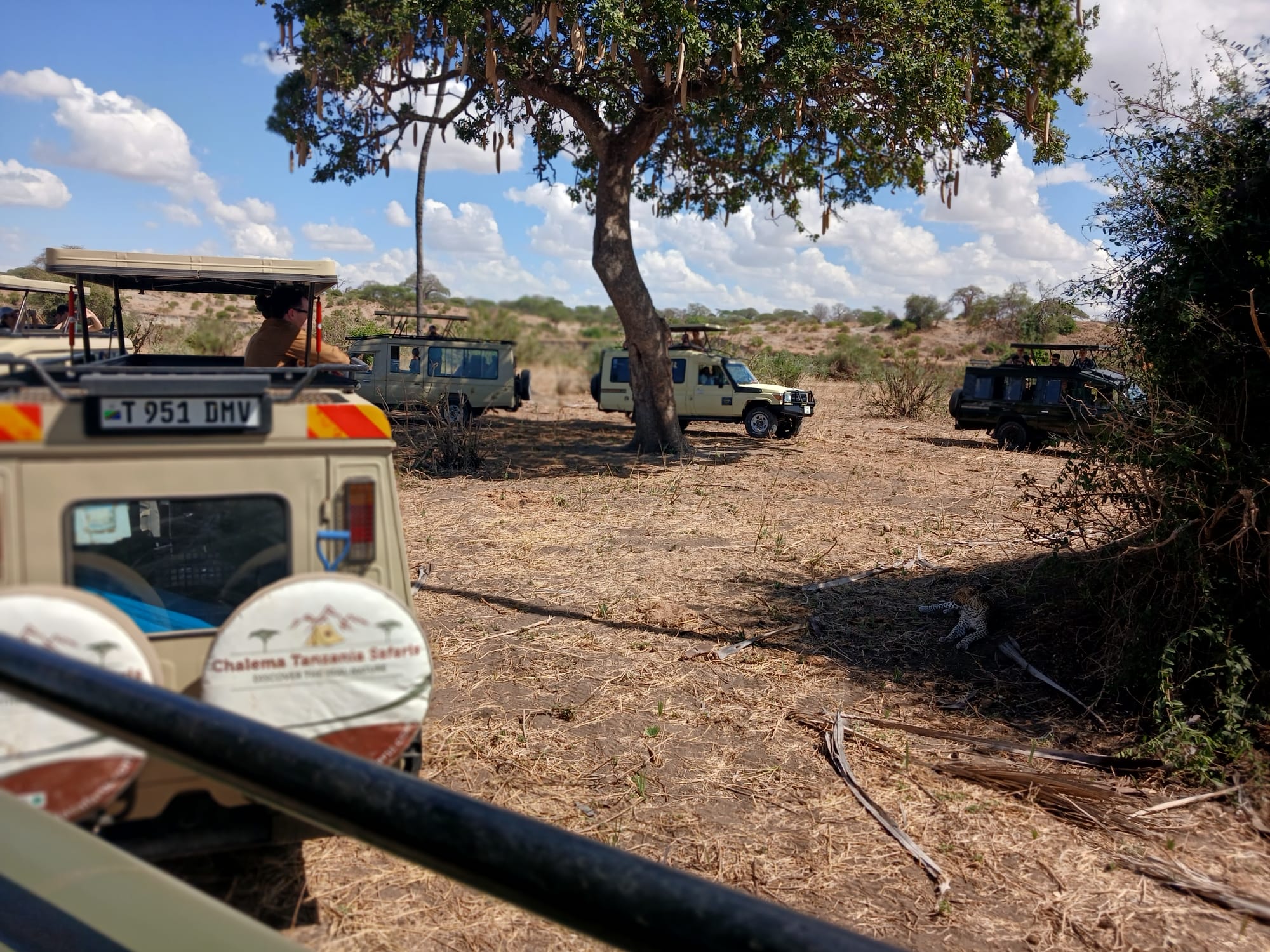 Here we have six Land Cruisers arrayed around a bush where a leopard is lounging in the shade (barely visible on the right). It's amazing how nonplussed the animals were by spectators. The tree is known as a sausage tree because its seed pods look like sausages – and make a lovely wispy sound if there's a breeze.