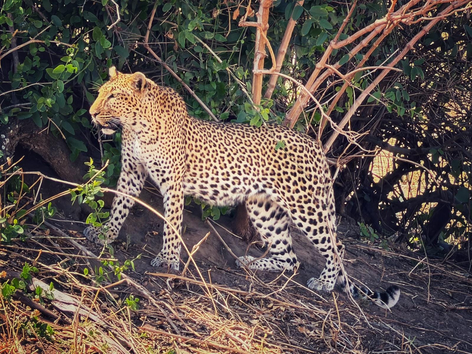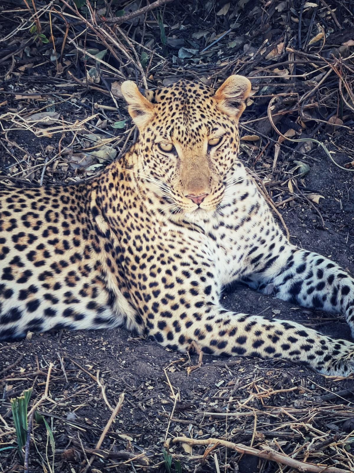 These animals used to be hunted (think ivory, leopard skin rugs). Somehow the park rangers trained them to see bipeds in jeeps not as predators but as nonevents. Photo below and many close-up photos are from trip leader Cathy. When I zoom in, my photos get fuzzy. She also is able to light up shaded subjects, like our spotty friend below.