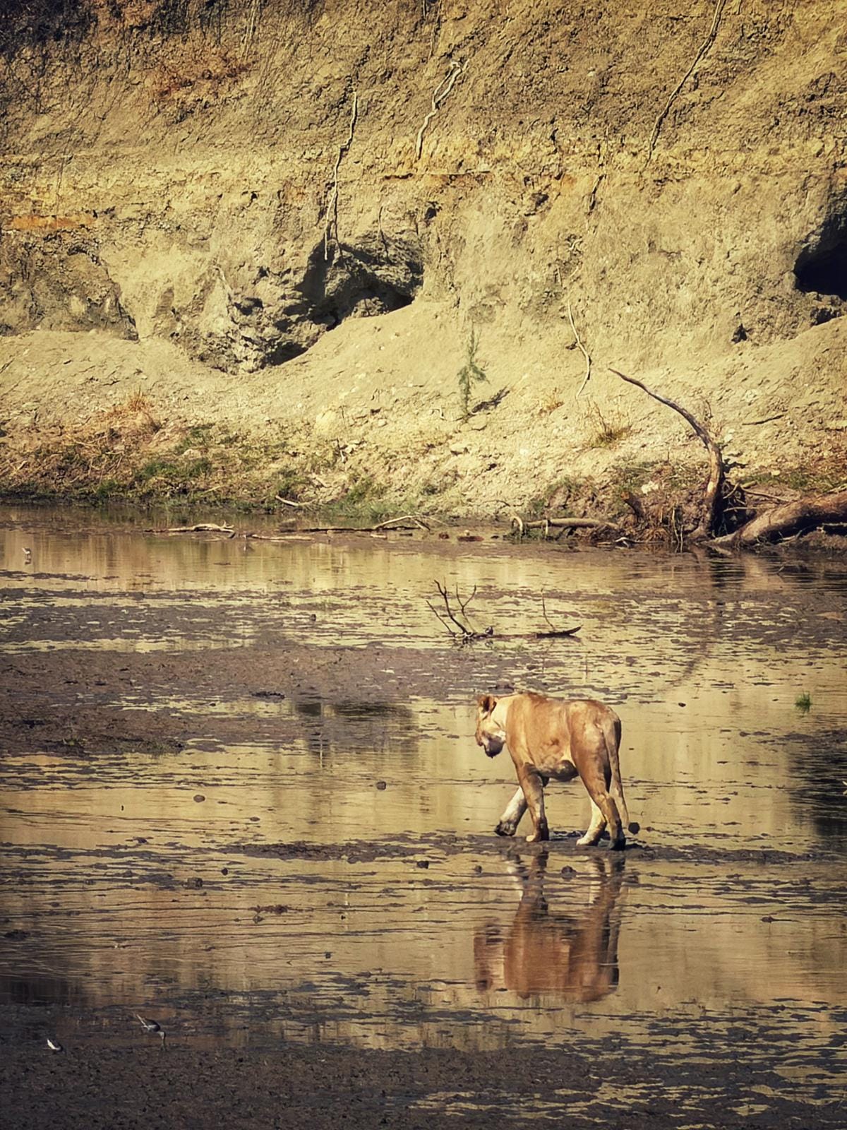 We saw three lions. This one heading upriver after leaving her mate by the river bank.