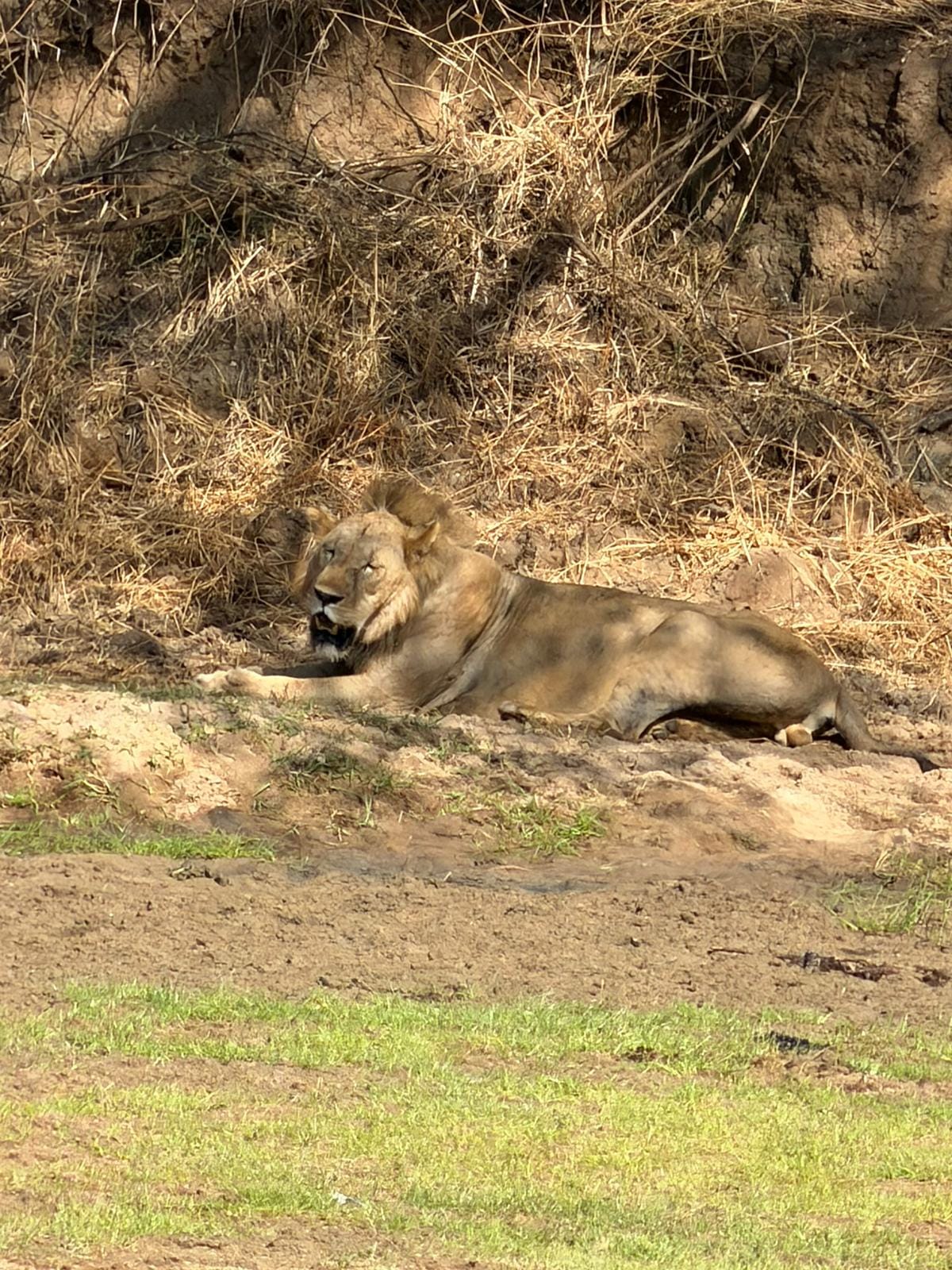 We saw three lions. This one heading upriver after leaving her mate by the river bank.