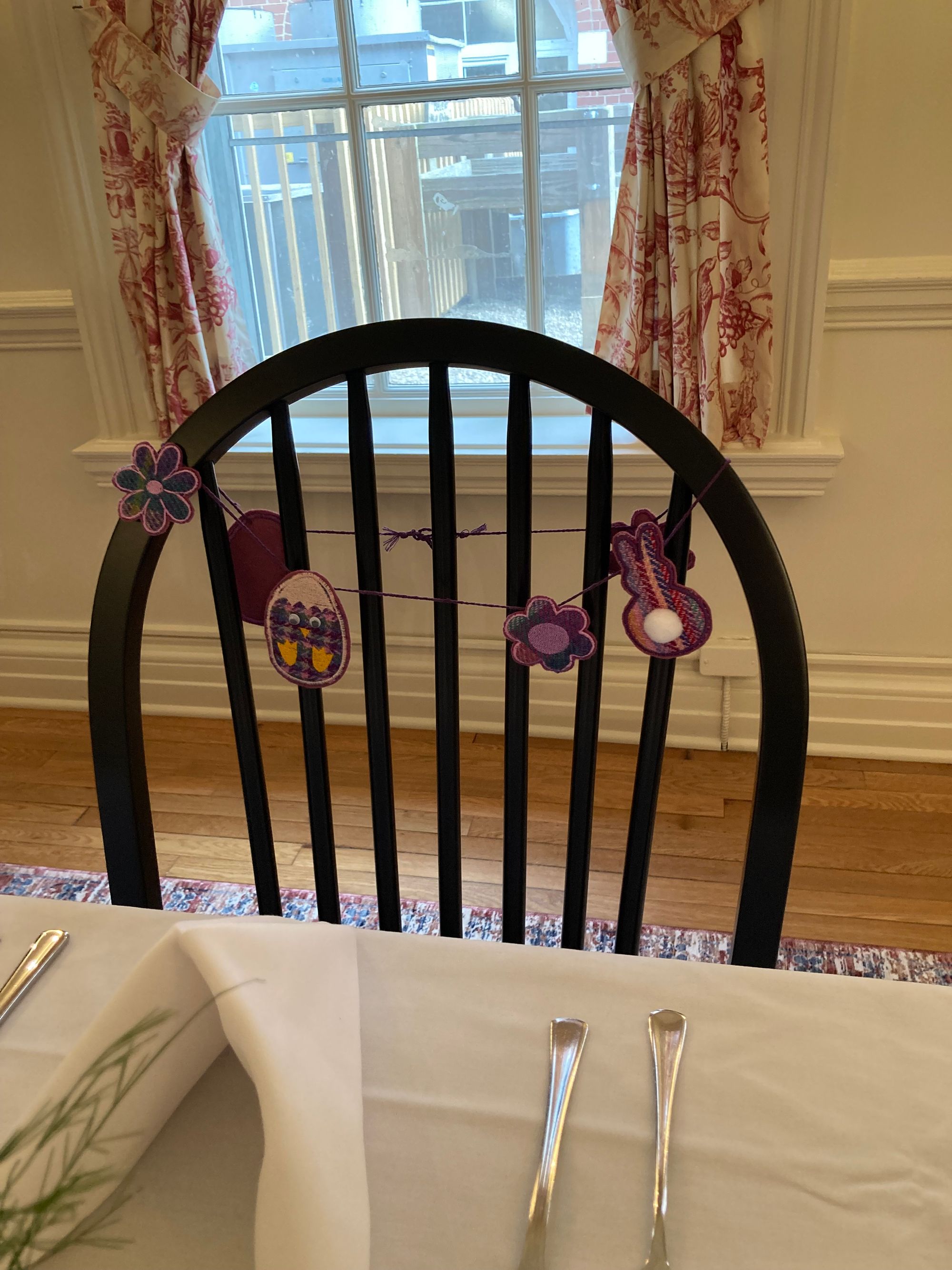 I gave her Easter garlands made from Harris tweed. I asked someone to take a photo so I could share it with the woman at St. George's Market who created them at my request. It seems like an odd present, but I had given mom tweed Christmas garlands and she just loved them. Mom is hard to buy for, so I stuck with a winner. She also has a big badge that says 90 on it--also out of Harris tweed. But I think she declined to wear it.
