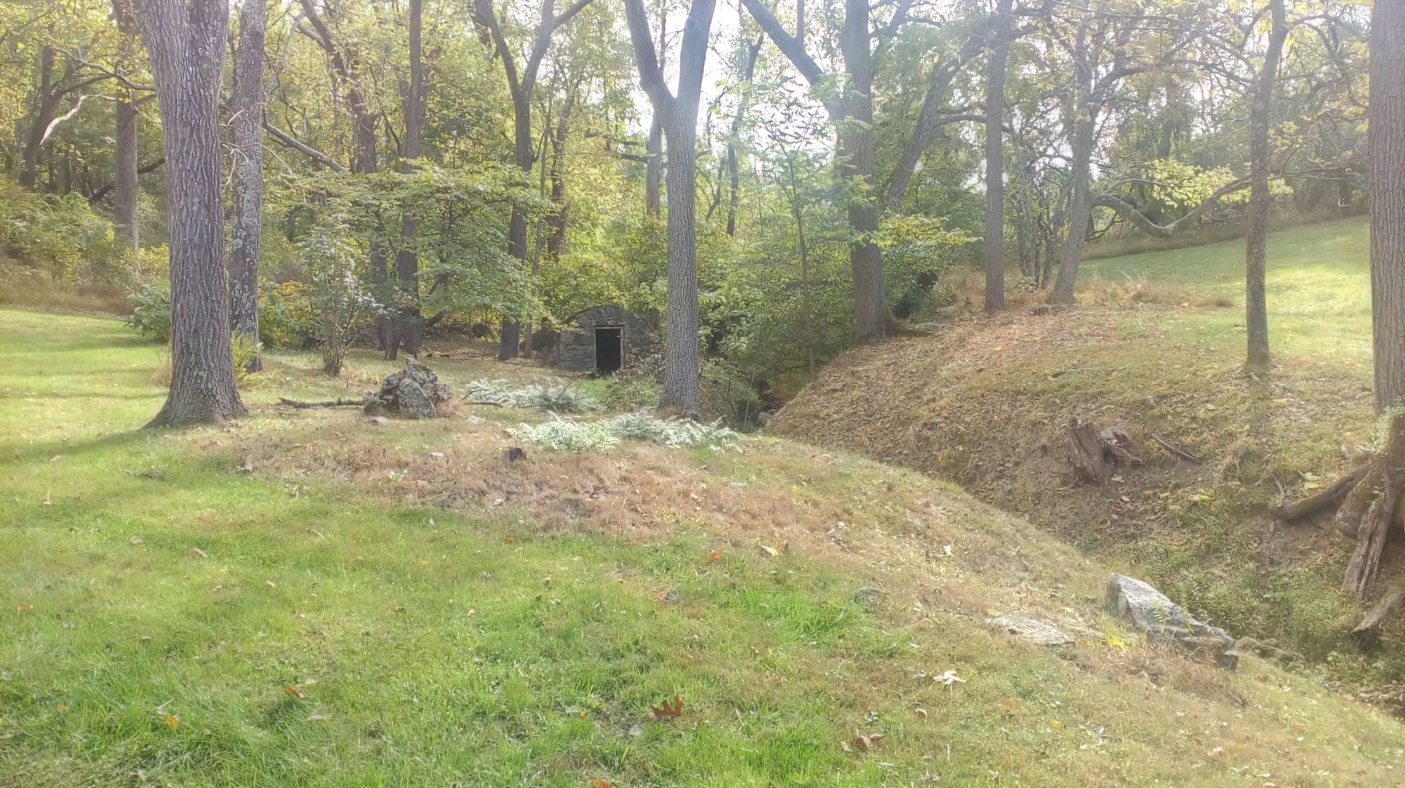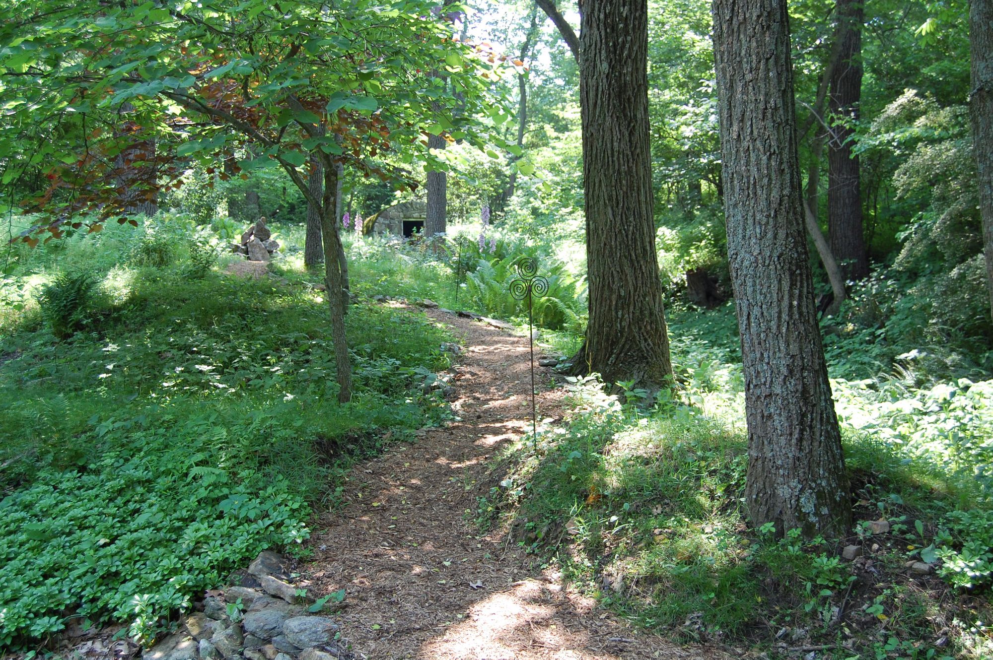 During the 15 years I lived in Chester Springs, I spent a great deal of my evenings and weekends returning the land to its native state. With mattocks (I went through four, bending the head of each), bow saws, a chain saw, an ax, and shovels, I removed thousands of vines from tall trees (mostly walnut trees) and dug up the vine roots. I also dug up or cut down mature Russian olive trees by the thousands. I did this along the treeline where field met forest all the way around the 4.5 acre property. My crowning achievement was the springhouse garden. I didn't know the property had a springhouse until I tripped over a stone wall while exploring the vine-infested forest, which truly was a dense jungle. It took me two years but I cleared a horseshoe shaped garden aroung the springhouse and planted it with native flowers and shrubs, and lots of ferns, maybe six or seven varieties.