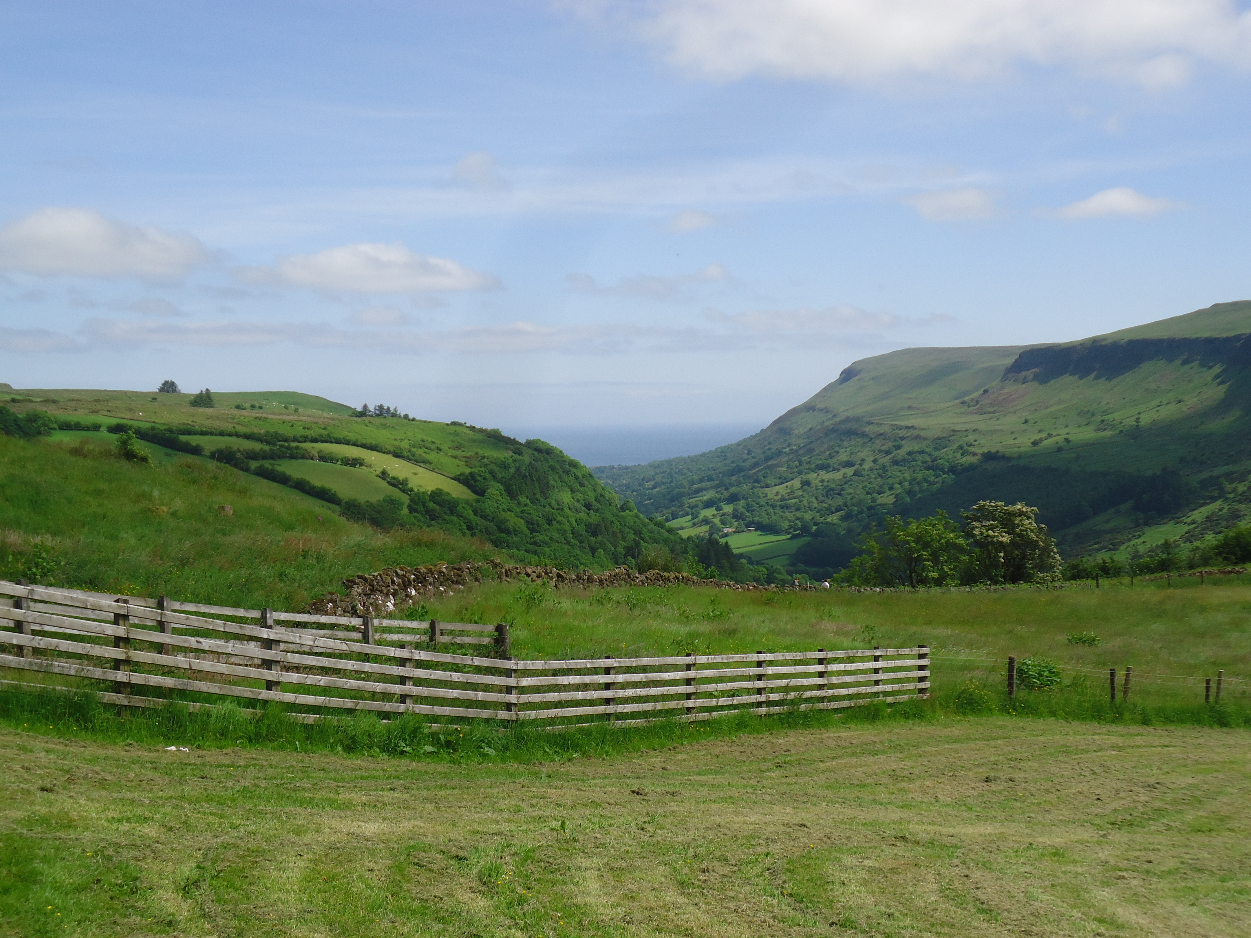 Today I took David to the airport so he could fly to Sheffield to visit his sister for the weekend. Then I took my friend Julie’s son to Queen’s for Q-Con. Ronnie is staying with me for the weekend so he can join 3,000 other young people at a techie nerd-fest (Julie’s phrase). After Ronnie set up google maps on my phone, I headed north to Glenariff Forest Park to hike one of the seven glens of Antrim. This is the top of the glen, with the Irish sea in the distance: