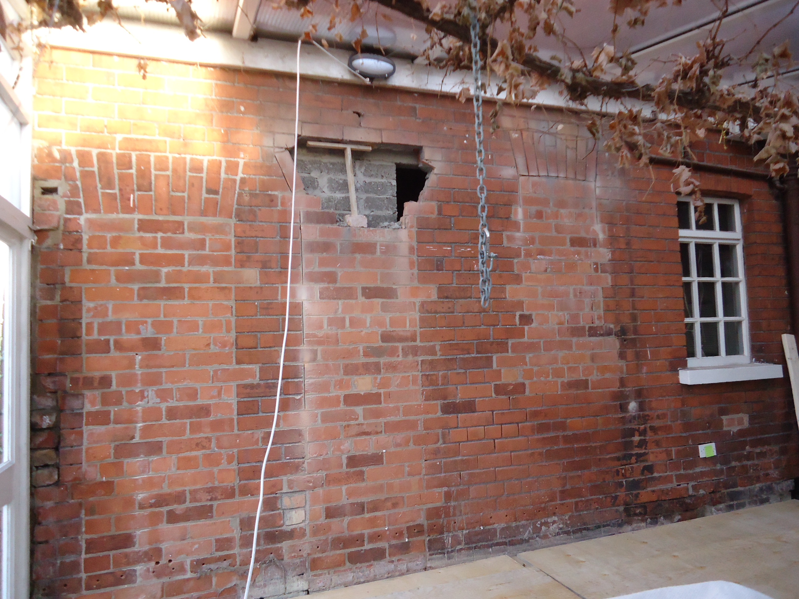 For any poor soul who read my explanation of what we are doing to this wall, you can now make sense of it. The original kitchen plan called for three additional windows to match the one that is there and to align with the pale brick patches (what once were a window and doors to an outhouse and coal shed). Main Contractor Colin told us Kitchen Colin's plan didn't make sense. Contractor Colin proposed a window all the way to the left to match the one on the right. Centered in between would be a wider window. He said he can move around the dark brick (and salvage brick from where the French doors are going) to get rid of the paler brick. I like his configuration much better.