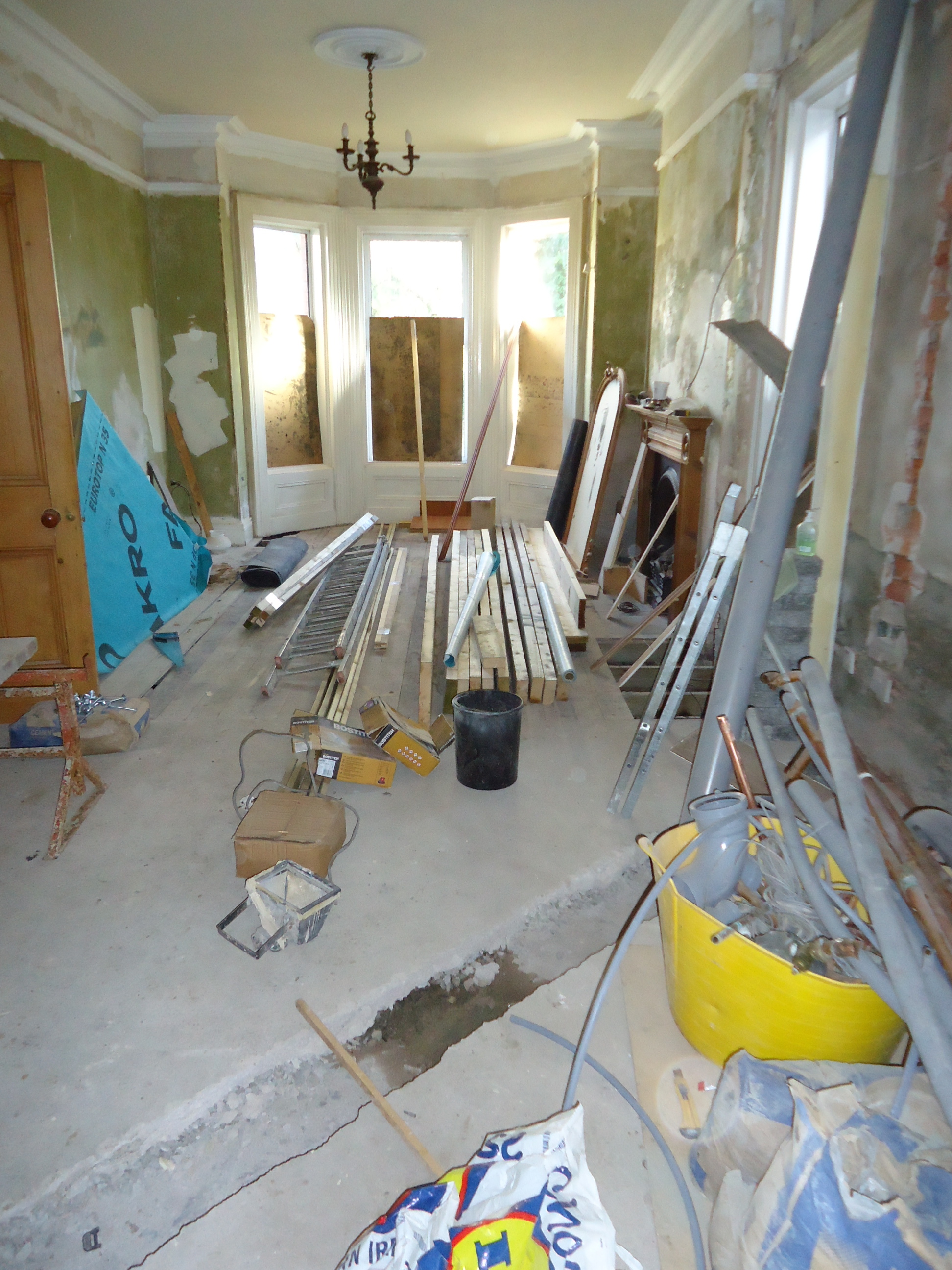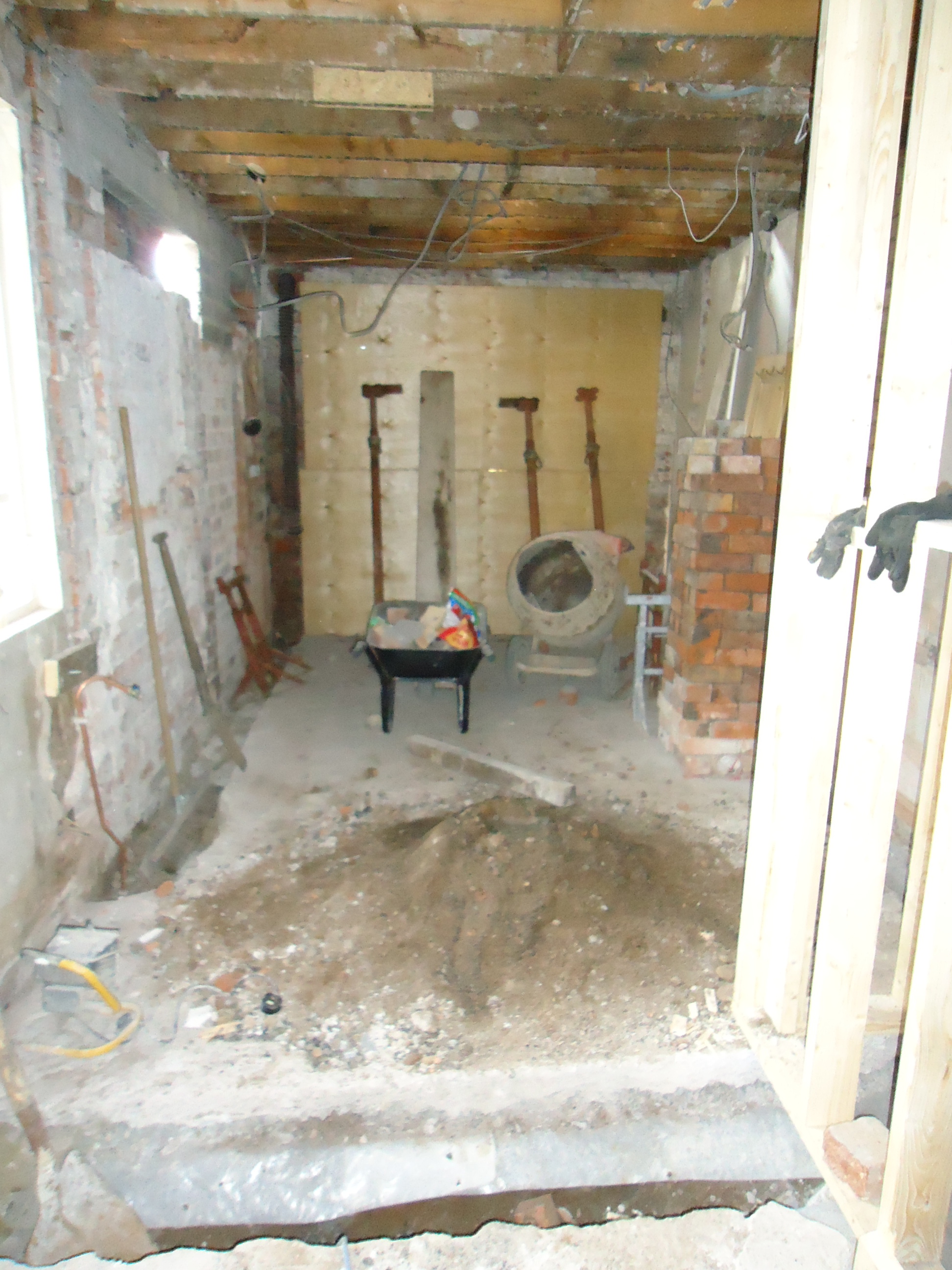 Inside of kitchen. The plywood at the end is where French doors will go at some point. The left-hand wall divides the kitchen from the conservatory.