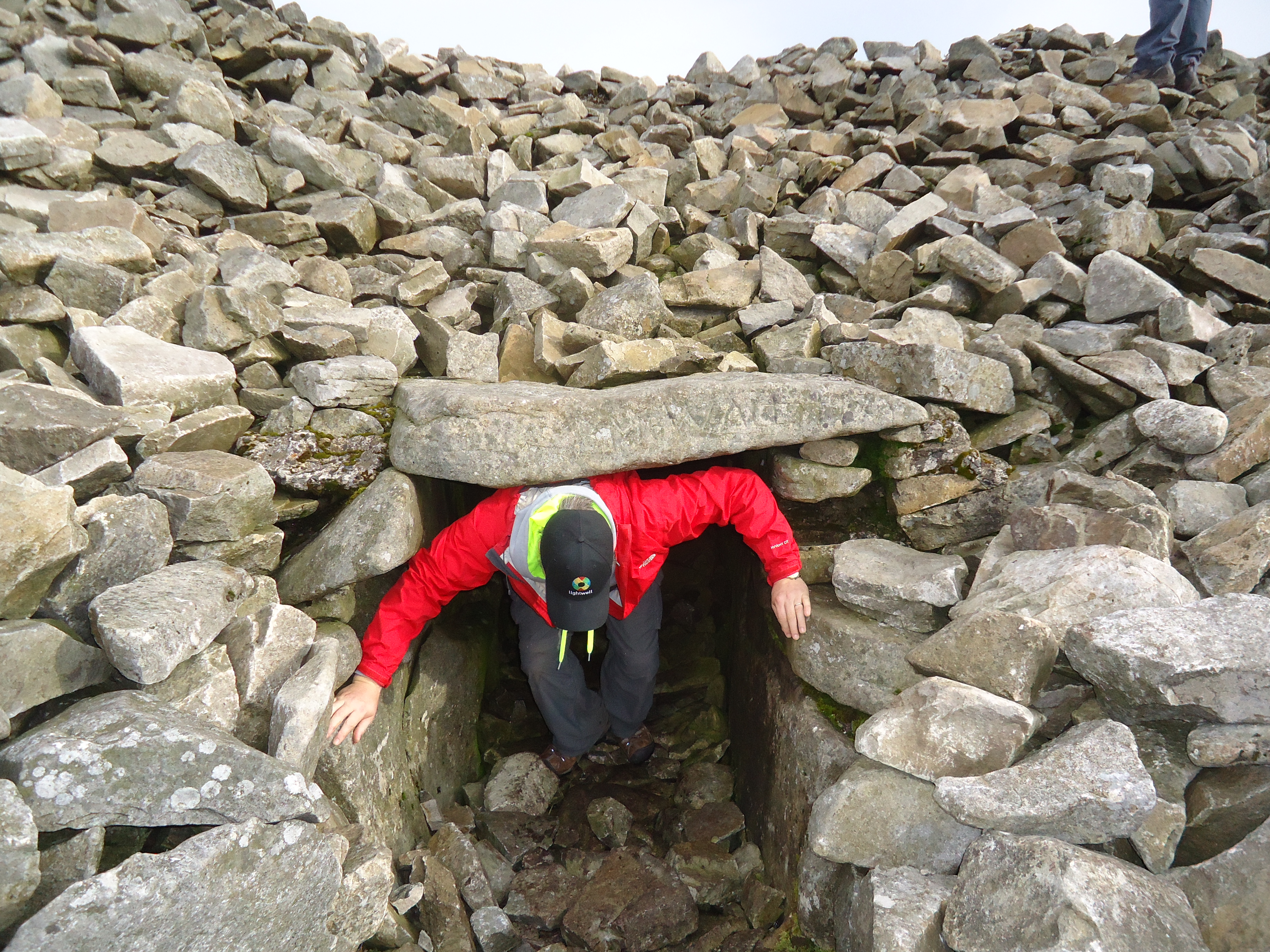 The aforementioned burial chamber, which you can climb into and stand up in. There were five of us in there discussing whether animals were sacrificed on the bowl-shaped rock. Here is David exiting the chamber.