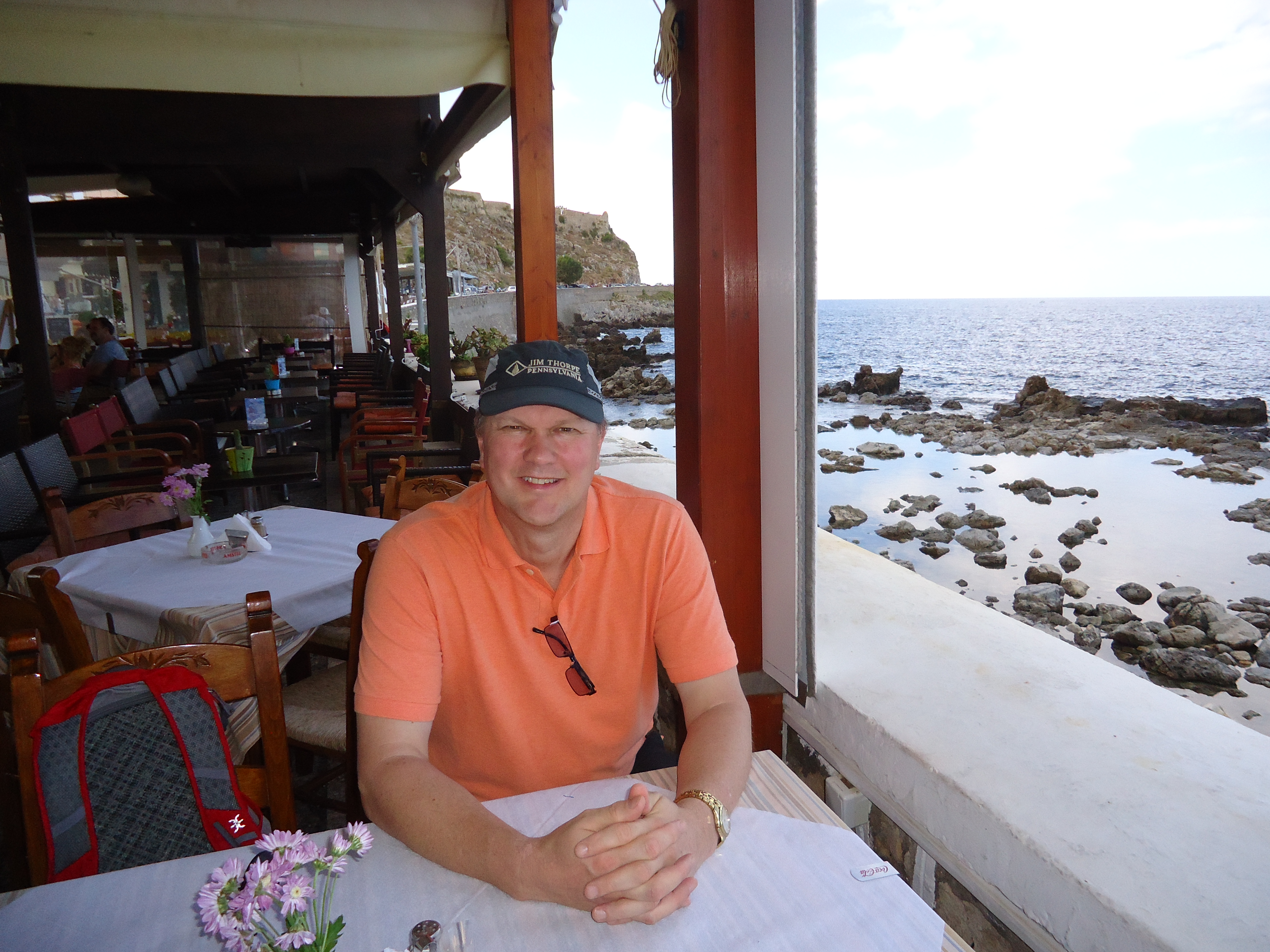 David and I have never done a package tour because he's very good at putting together wonderful vacations on his own. However, the cheapest way to do a week in Greece is with Thomas Cook package holidays. For 800 pounds, the two of us will fly to Crete directly from Belfast on a Thomas Cook plane, and spend a week at a hotel where we'll have a daily breakfast. That's roughly $600 each for a week in Crete. Not bad. We are staying in Rethymnon, with its endless cobbled streets and alleys, its royal blue ocean, its ancient fort and churches, and its blend of Venetian, Turkish, and Greek influences.