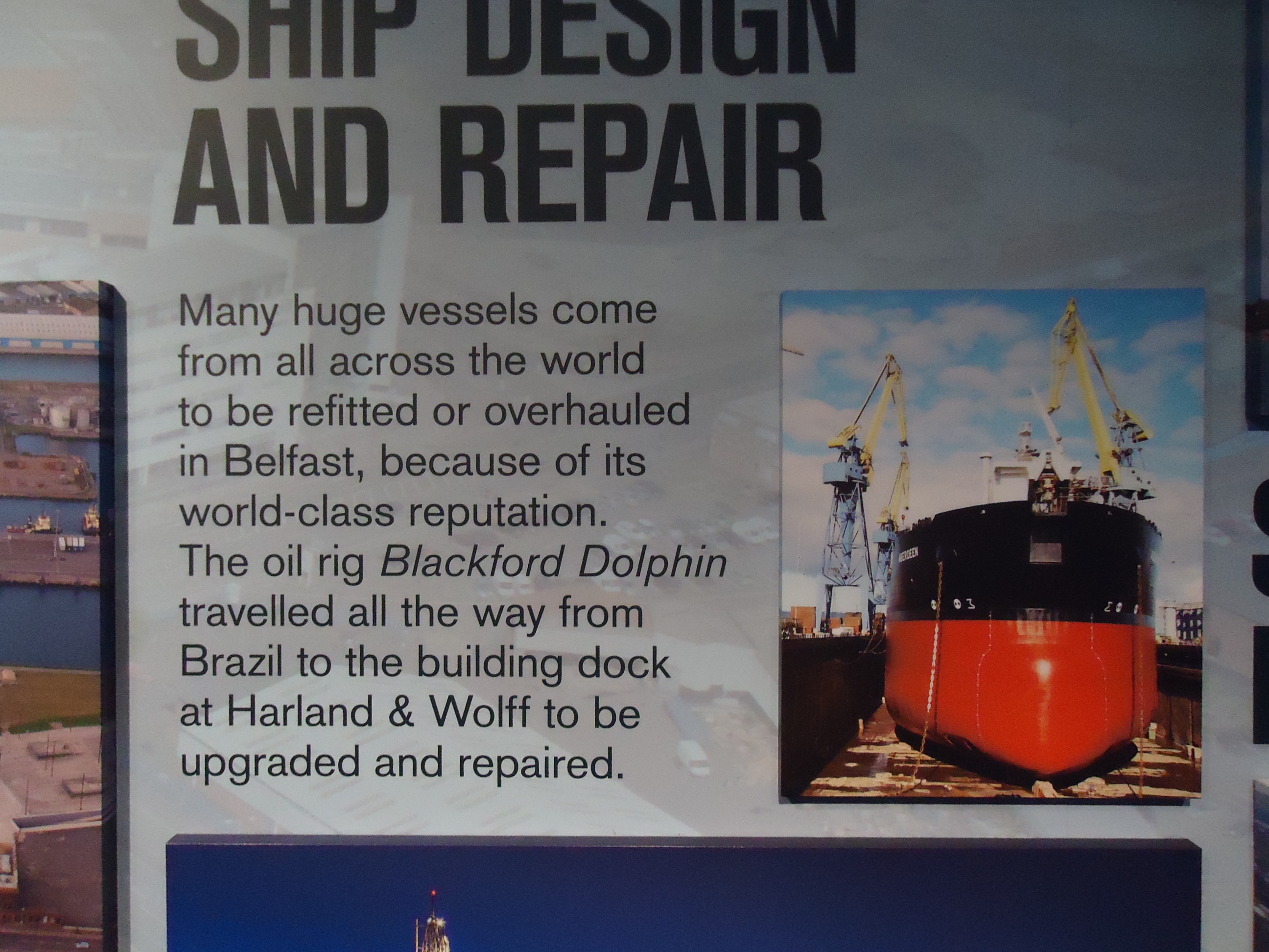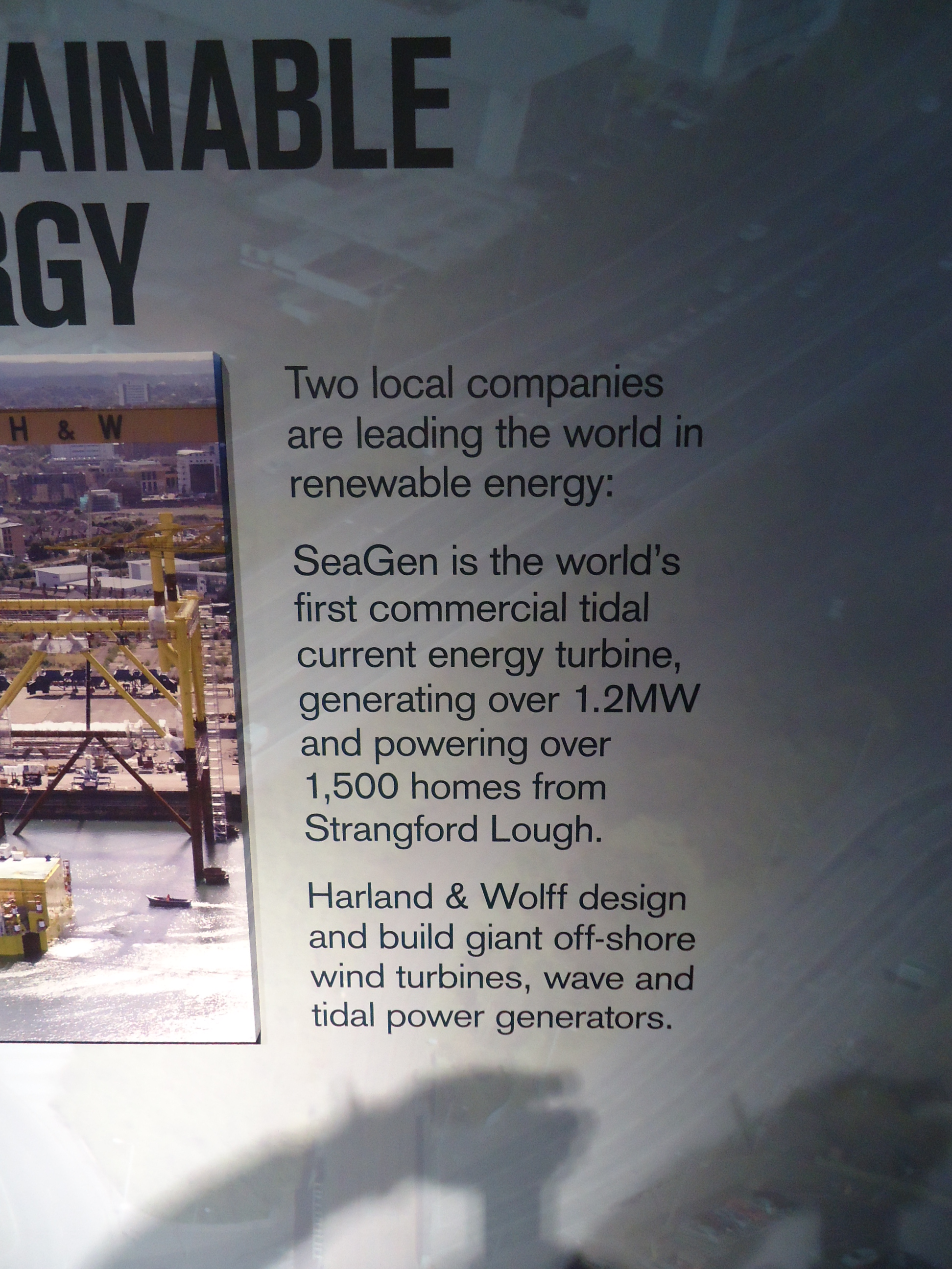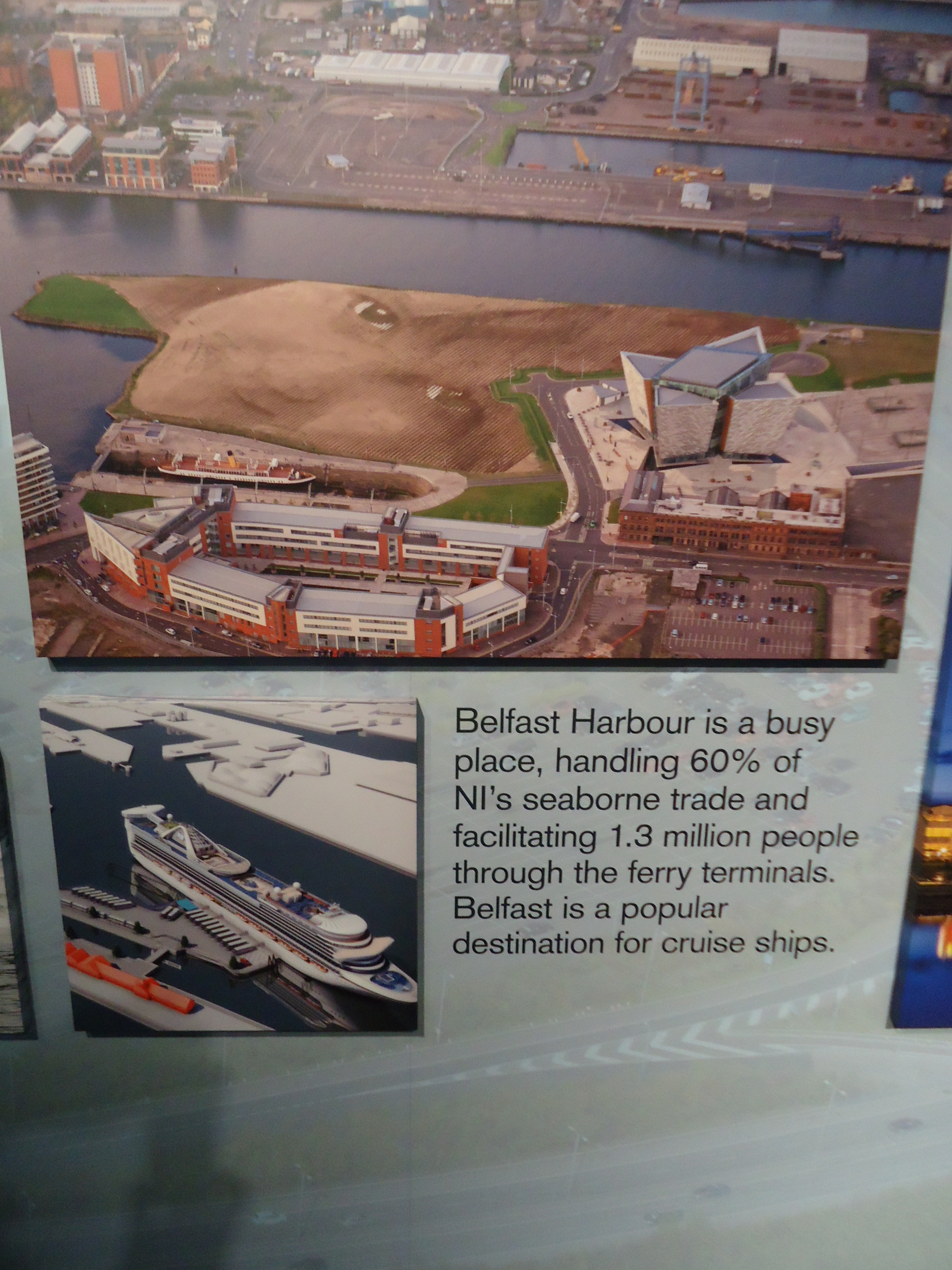 I find myself drawn to the panels about Belfast's history as a manufacturing town (linen, ships, ropes, whiskey, tea, tobacco products, and the equipment used in linen factories and in shipbuilding). At the end were panels on modern Belfast, such as these three: