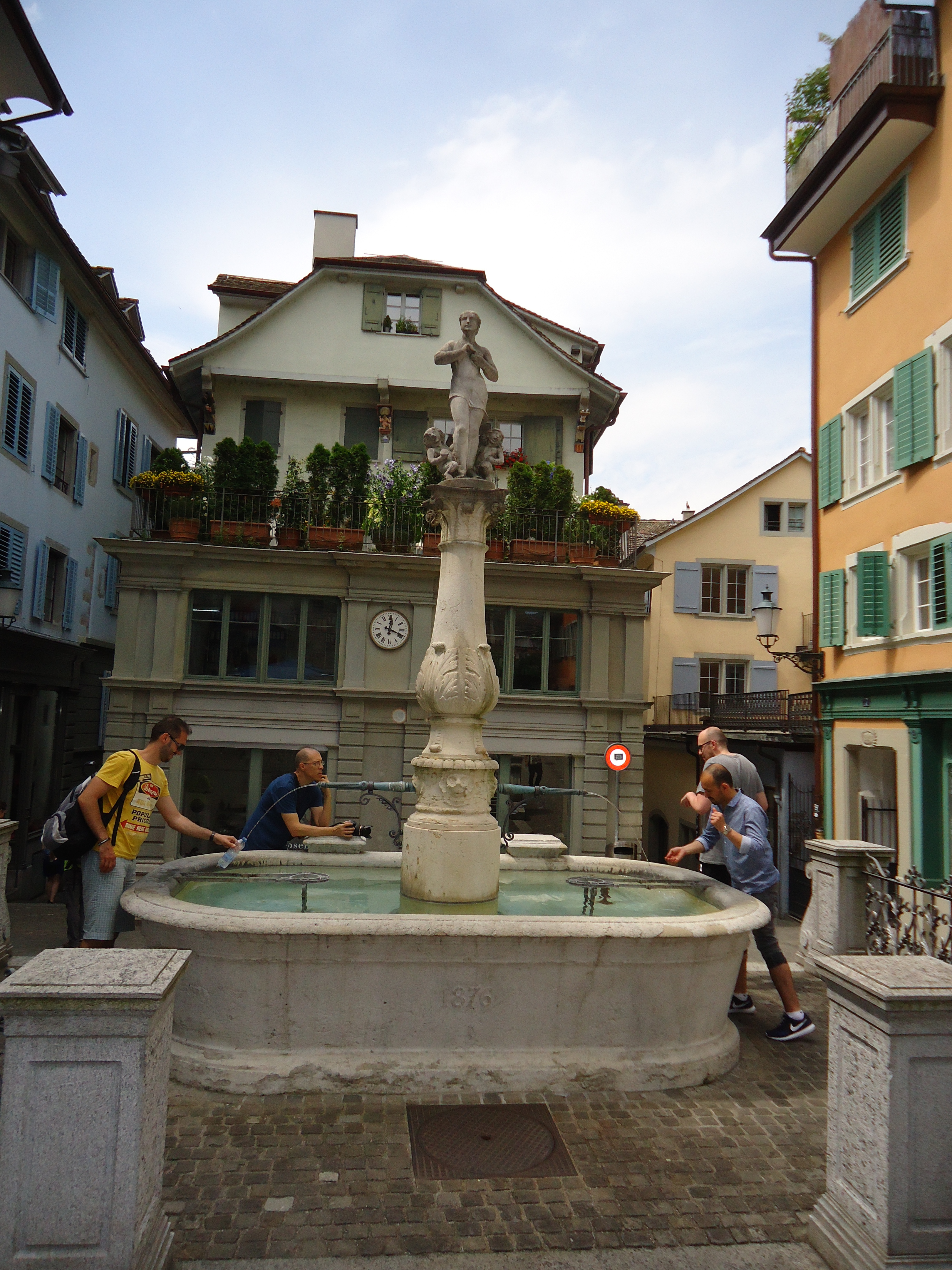 There are more than 1,200 fountains in Zurich. So you can get free clean cold clear water anywhere. Sorin from Romania on the left, Colm from Ireland and Majoub from Afghanistan on the right. The fourth guy isn't one of ours.