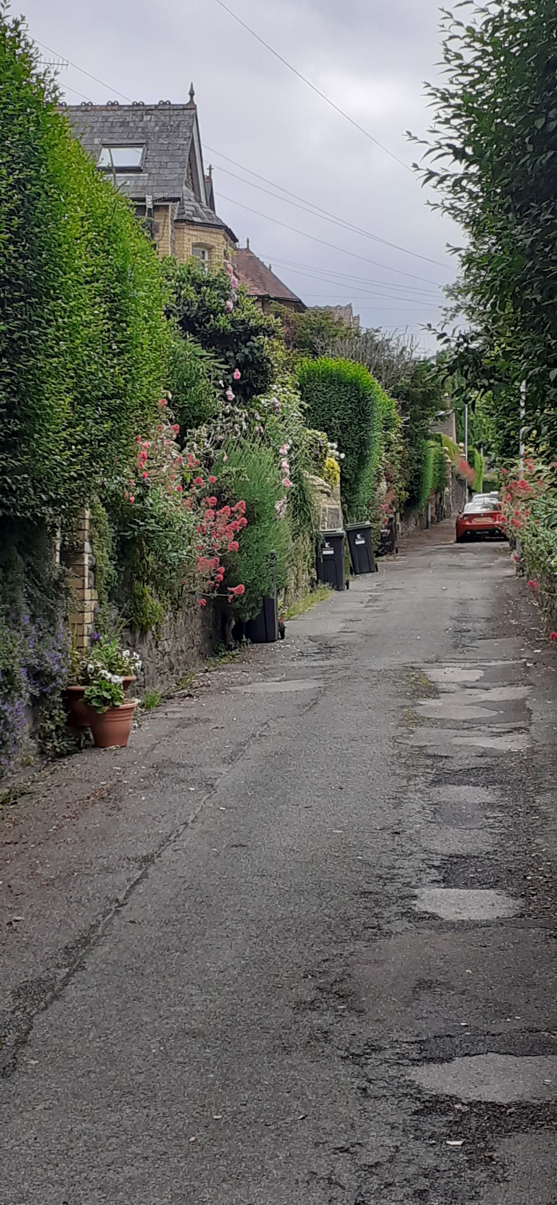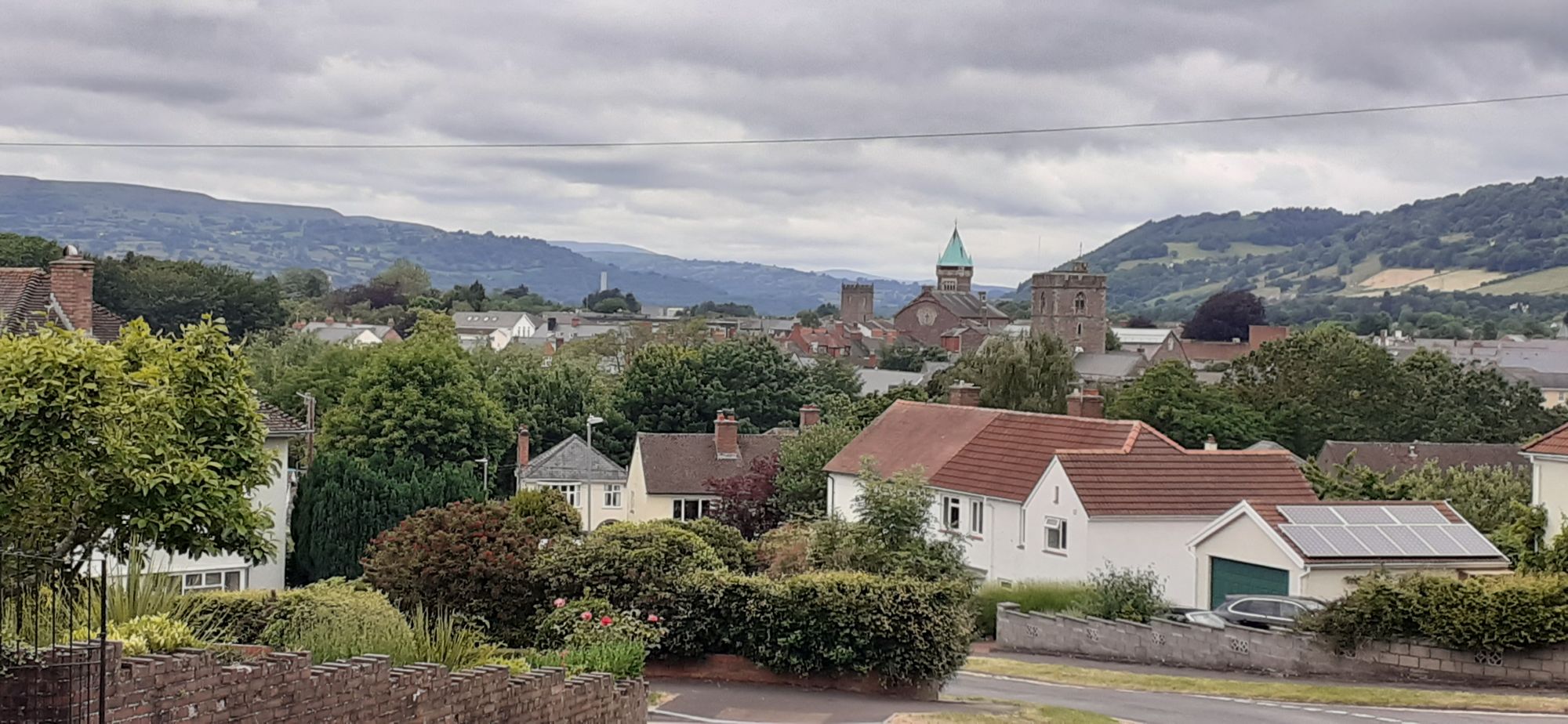 On a map, the Brecon Beacons--mountains surrounding the town of Brecon in south Wales--are not that far from Belfast. However. To get there meant a taxi at 6:30 am to Belfast Internatiional Airport, a flight to Bristol, arriving around 10 am. A 30-minute shuttle to the Bristol train station. A 45-minute train to Newport. Then, after a 45 minute break, a 30 minute train to Abergavenny, arriving around 1:30 pm. Where I had to kill 2 hours because I couldn't check in until 4pm in Brecon, 40 minutes away by taxi, the final leg of my long day. Below is a view of Abergavenny as I walked into town from the train station.