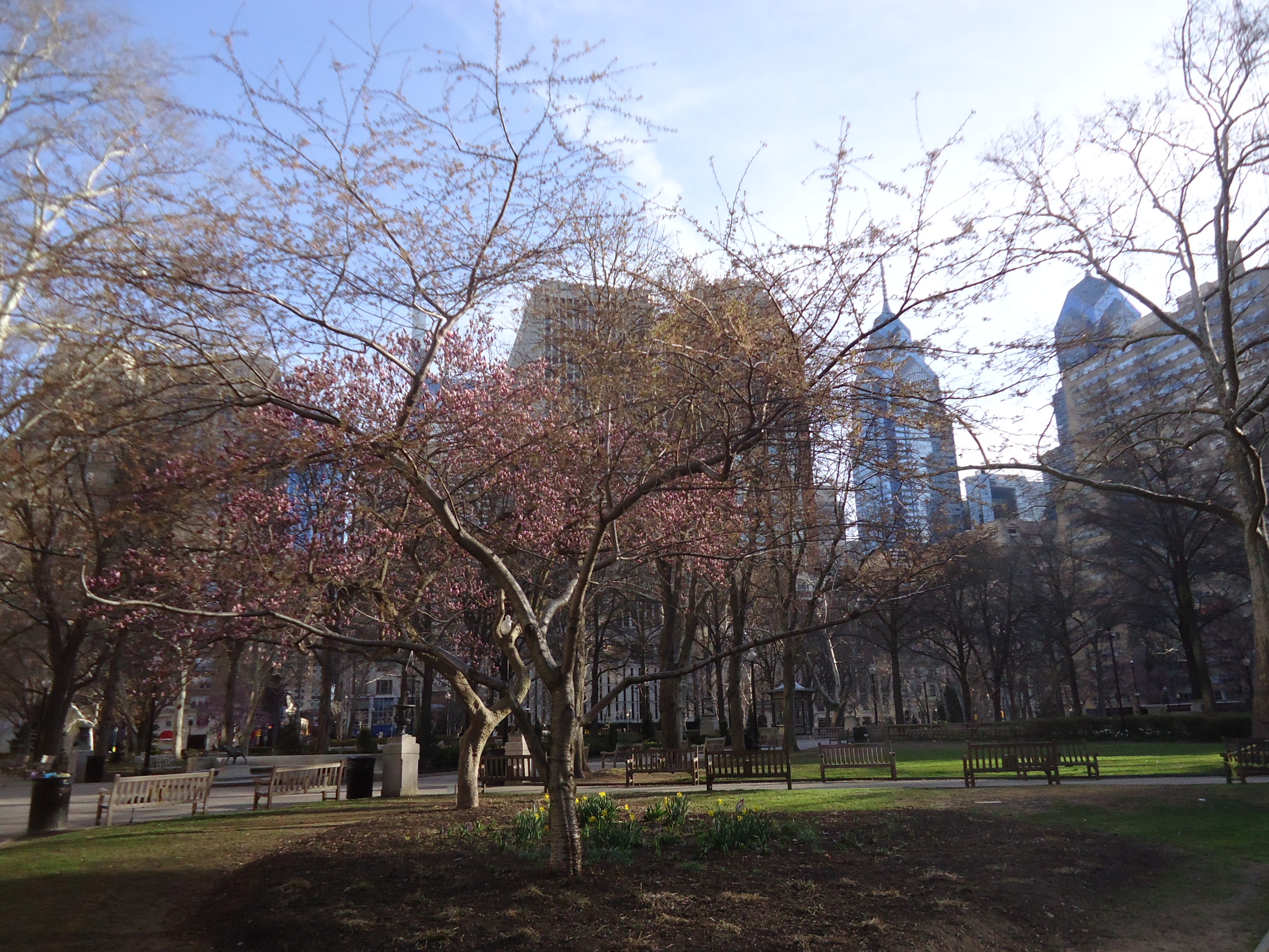 I had a great time with Laura and Phil talking about families. Laura’s, Phil’s, mine. Because of my own experiences, I’m really interested in how families function, or don’t, given the endless possible combinations of personalities. They sent me on my way this morning to Suburban Station to catch the Septa train to Bryn Mawr. Here’s the view from their building of Rittenhouse Square: