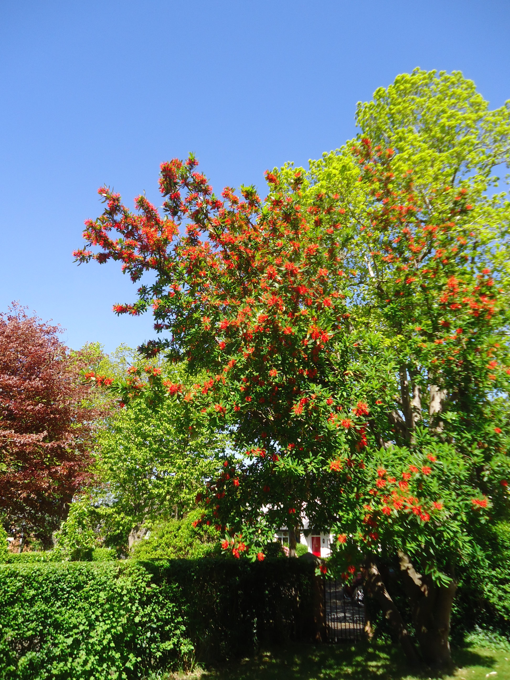 Our street, Cherryvalley Park, is referred to as the park because it is lined on either side by mature lime trees, so the length of it is a tall canopy of green. But in addition, every front garden has a lovely tree. We have a Chilean fire tree.