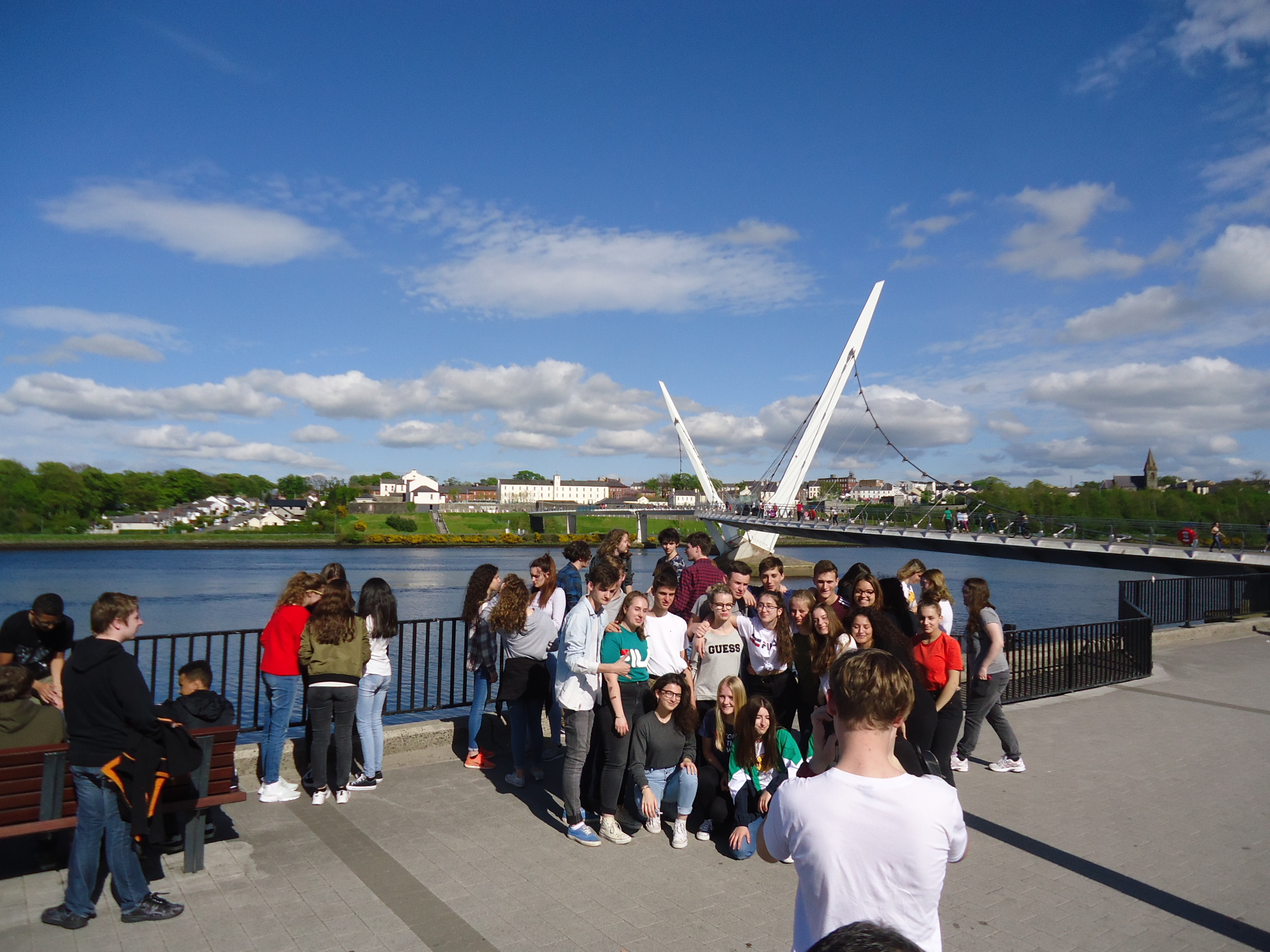 No photos from the day so here’s a photo I took before I caught the bus from Derry back to Belfast after the jazz fest: A school group in front of the pedestrian bridge.