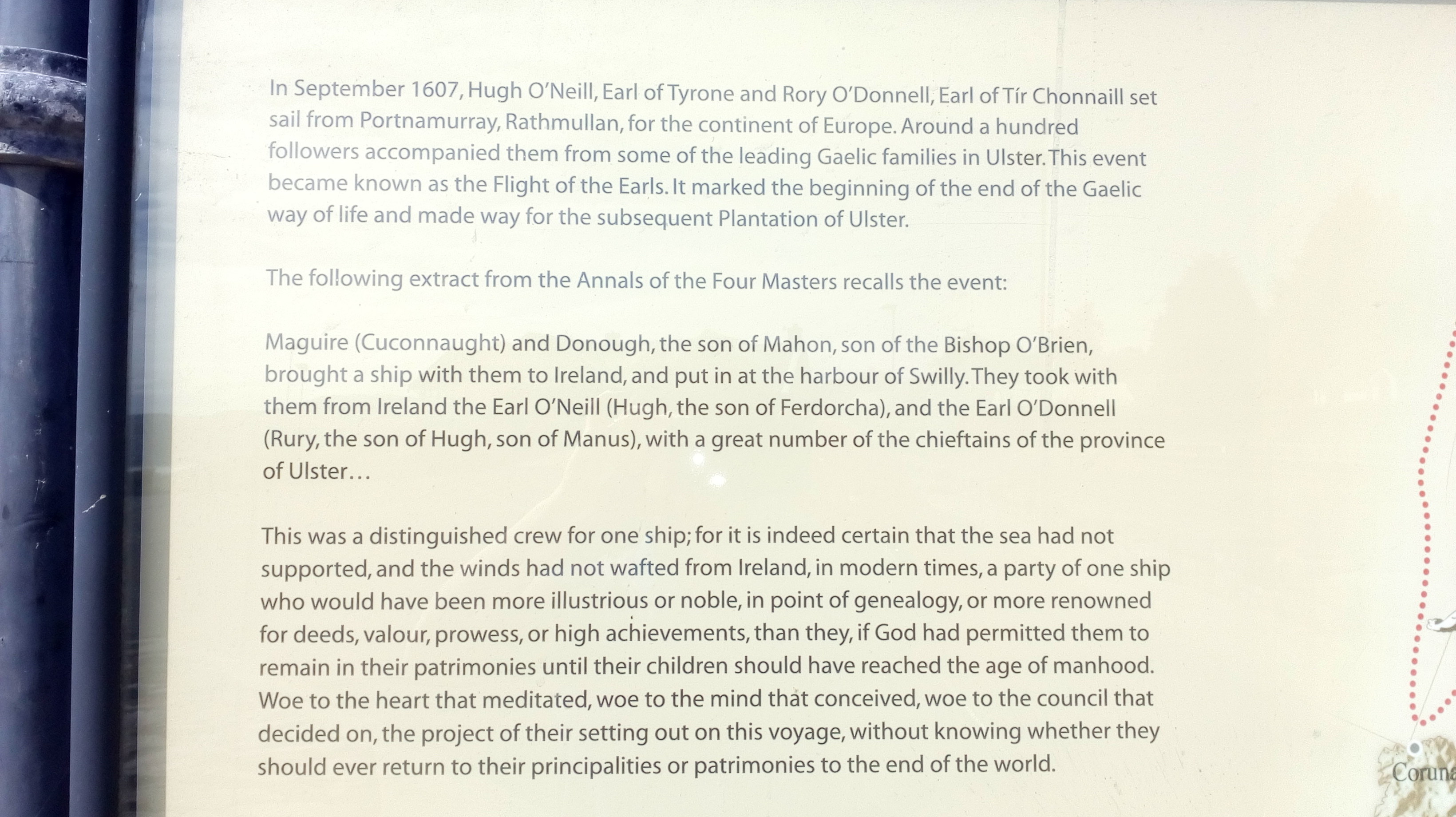 I’ll take this opportunity to put up some photos I took way back in July near Rathmullan. I didn’t realise Rathmullan was the site of the famous 1607 Flight of the Earls, described in these roadside signs. My Wiki-based understanding is the English very cleverly turned one kinsman against another in the Gaelic clans--a jealous brother or cousin, whatever. And during the course of the Nine Years' War, the larger, better armoured English army wore down the militias of the various clans. Which lead to the flight of the Gaelic ruling class in the north. And subsequently to the Plantation of the north--tens of thousands of acres of land awarded to English generals and noblemen, who then imported Scottish labourers to work the lands. This was the genesis of the Troubles, as the Protestant Ascendancy emmiserated the native people of Ireland.