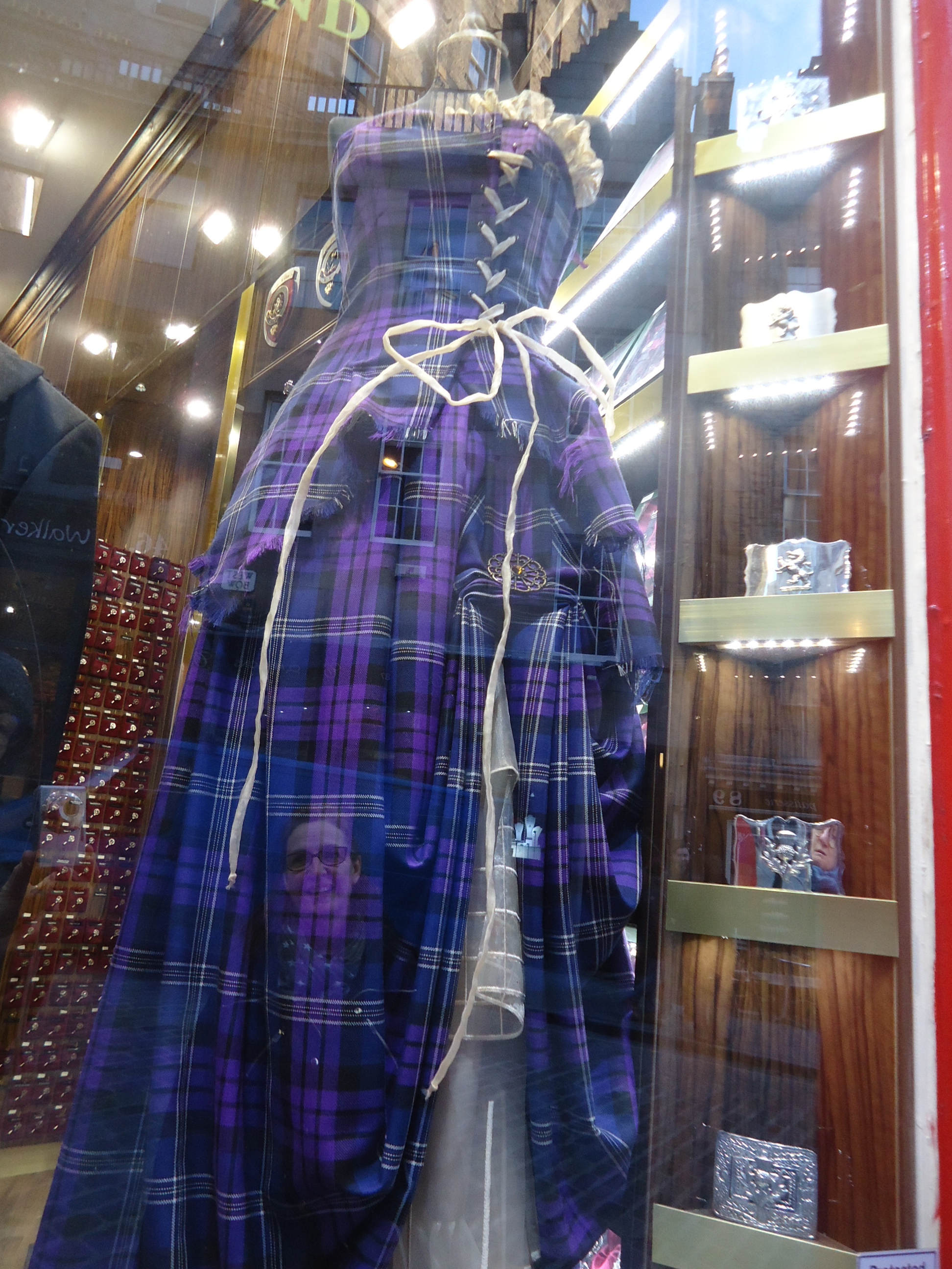 I thought the wedding dress was vintage until I saw the purple dress--I think both are up-to-date but inspired by traditional Scottish fashion.