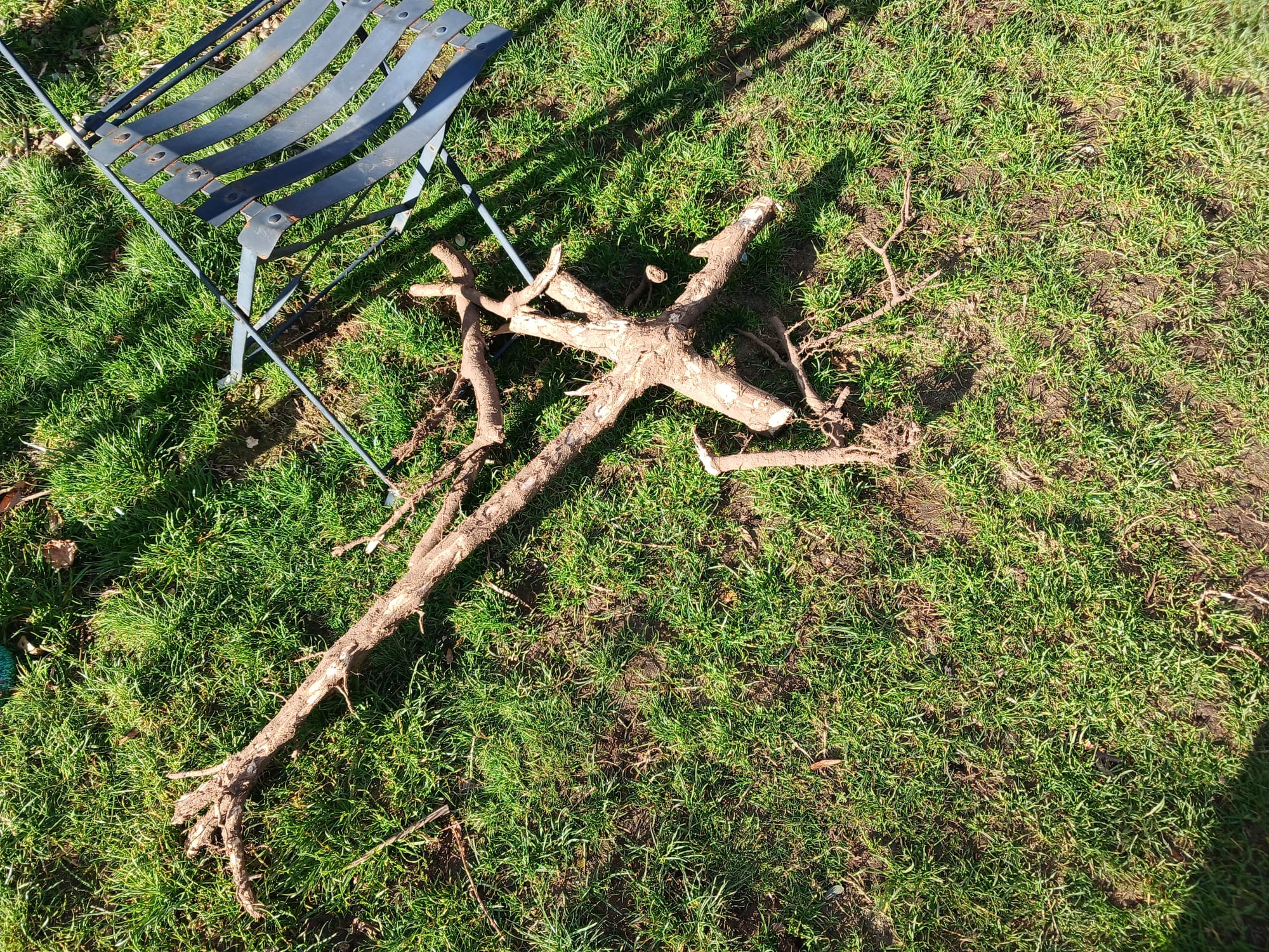 The roots were right at the surface and I think they are part of the reason for patchy grass. They belong to trees that are no longer in the garden. Here's another one.