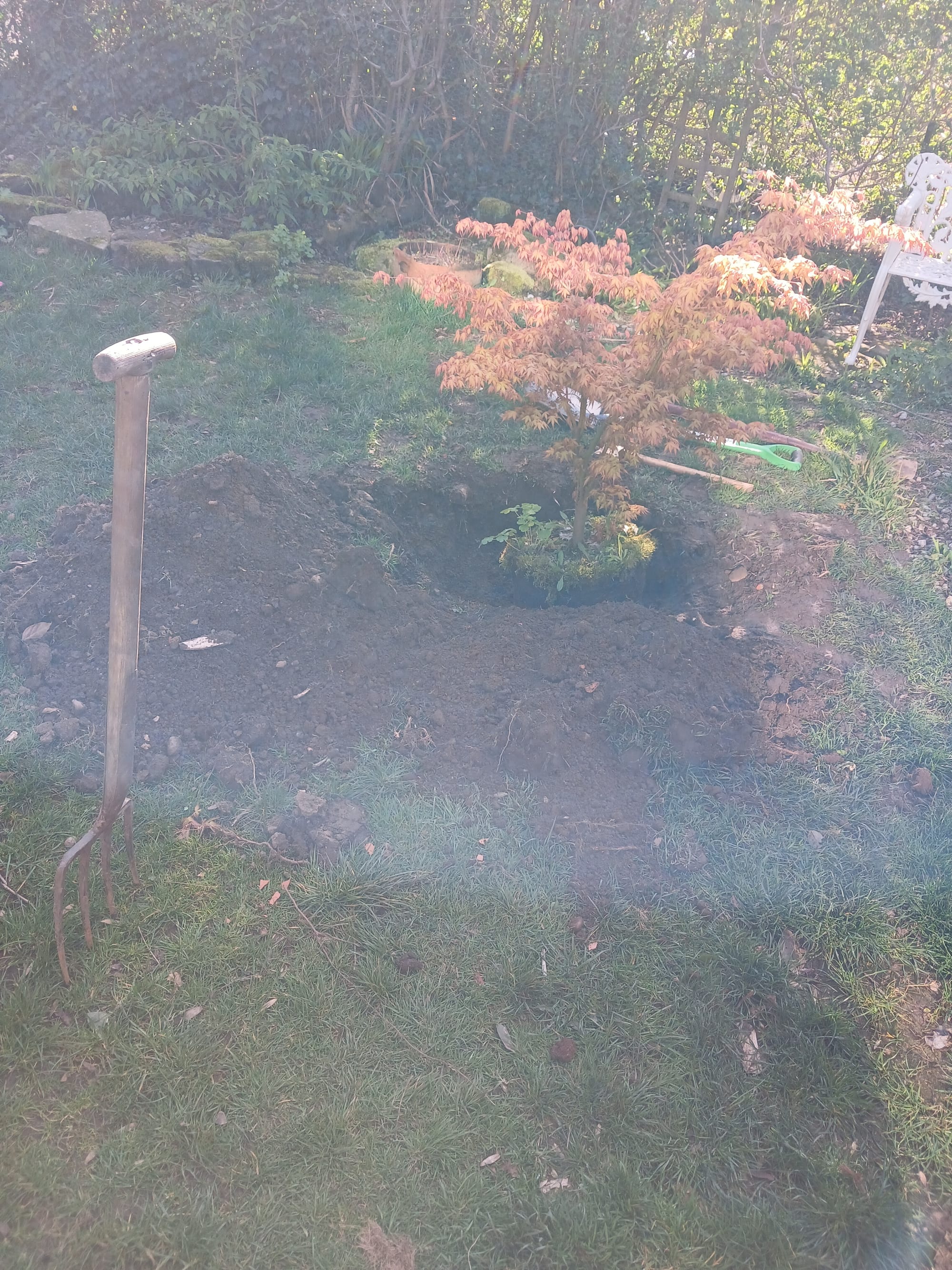 The stepping stones used to be in a row parallel to and very near the back porch to create a little garden. I dug them out and reset them in the lawn. I also dug a huge hole to transplant an acer from a large pot into the ground. I also dug four holes for two daphne bushes and two viburnum--I'm trying to improve the border gardens.