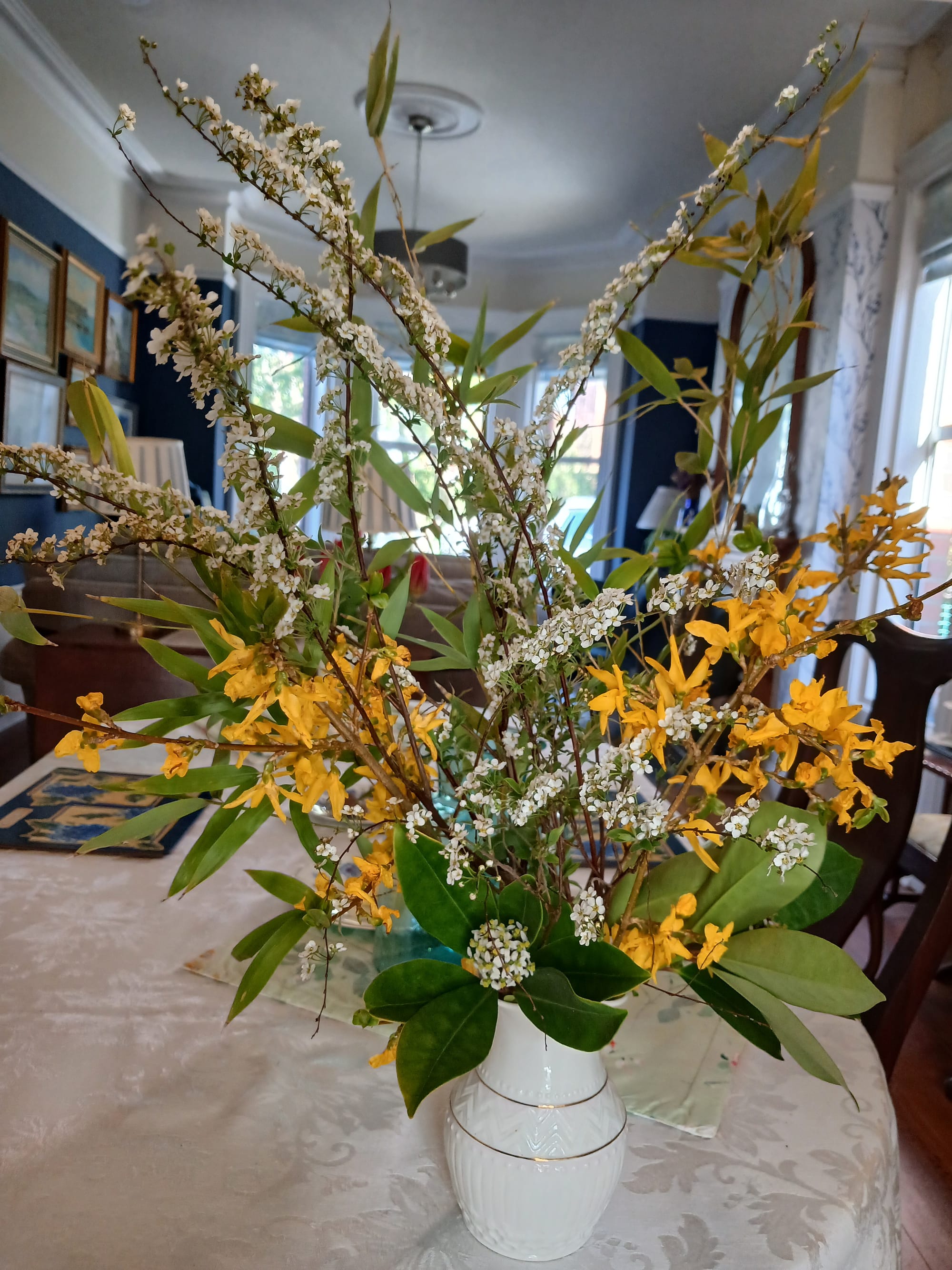 For Easter, I had some friends round for brunch. One friend, Thea, brought these flowers from her garden. The tall white stems are from a bush called bridal veil – I have one in my garden cleaved from the plant that produced these stems.