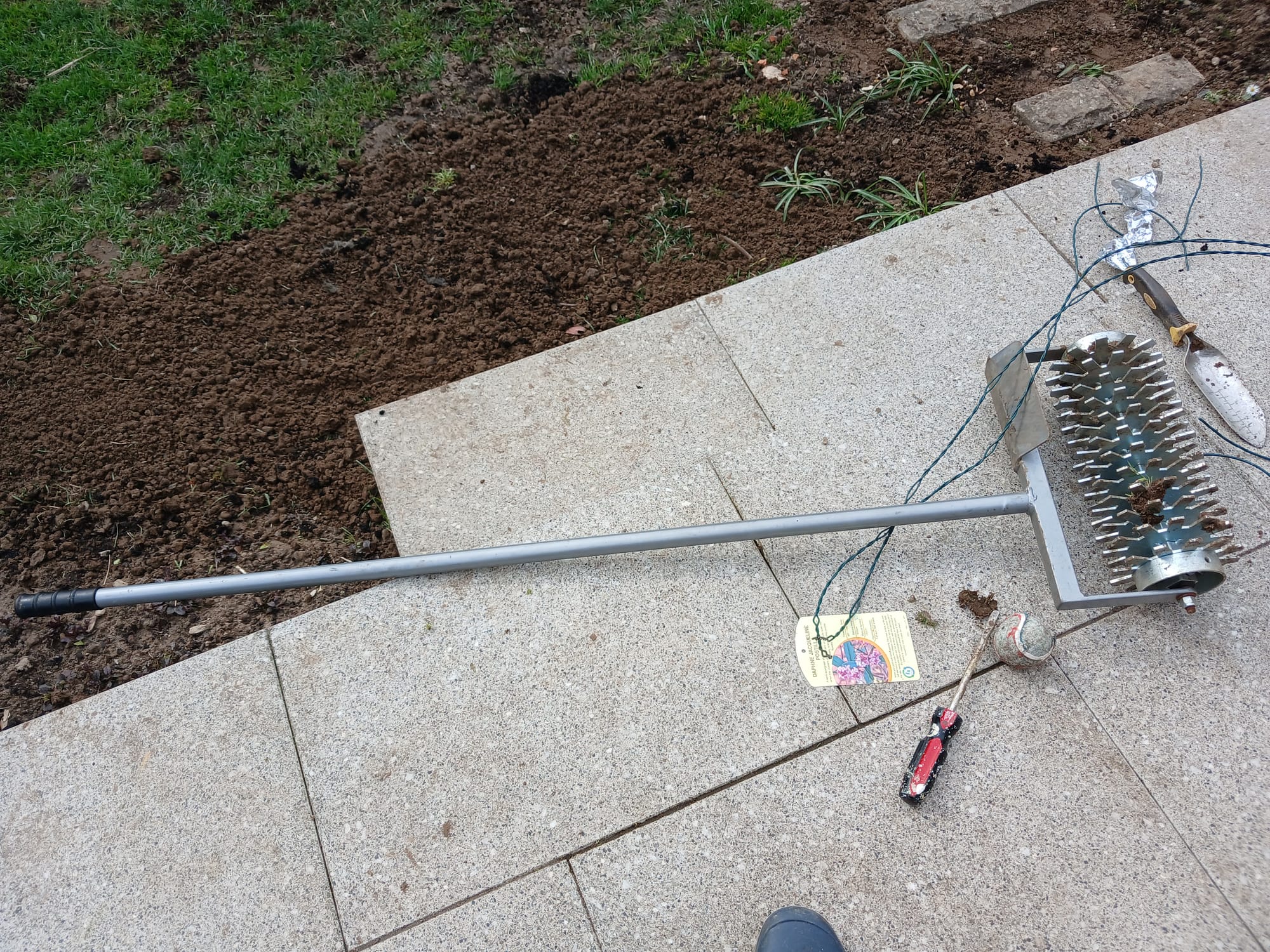I filled holes in the lawn with the soil and tried to even it up. A greenskeeper from the golf course loaned me this tool/torture instrument: