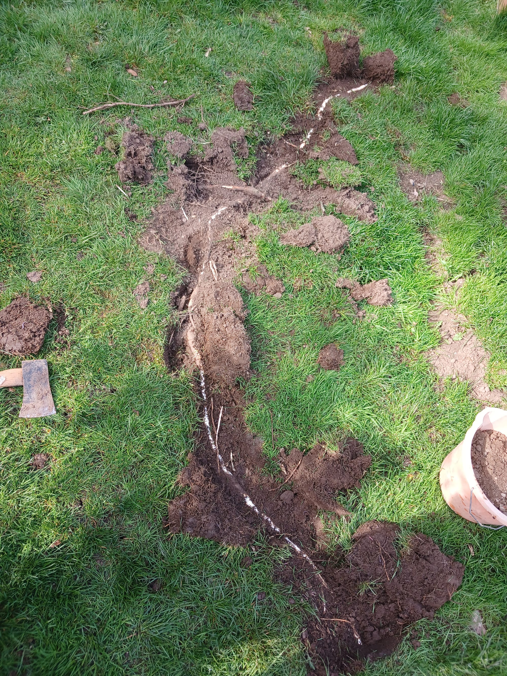 To prep the back garden, I shoved a pitchfork all the way into the ground then wiggled it forward and back, side to side, creating four holes, which I carefully filled with sand. There were hundreds of sand holes by the time I finished. I also dug the pitchfork halfway into the soil over and over again to loosen the remaining ground. And I removed a lot of roots using an axe. Here's one.